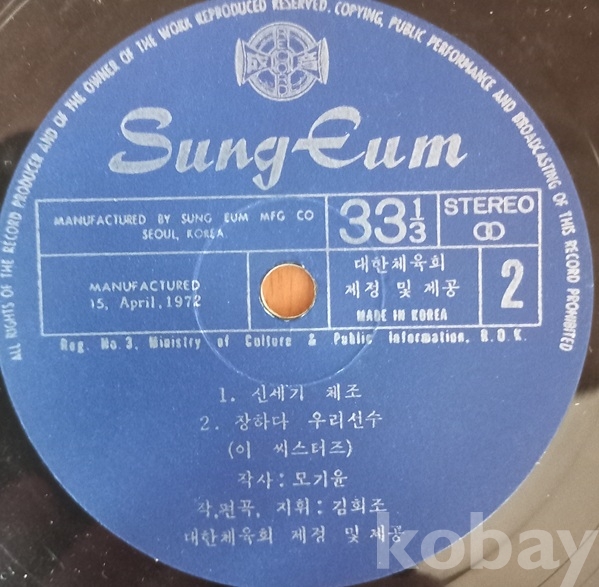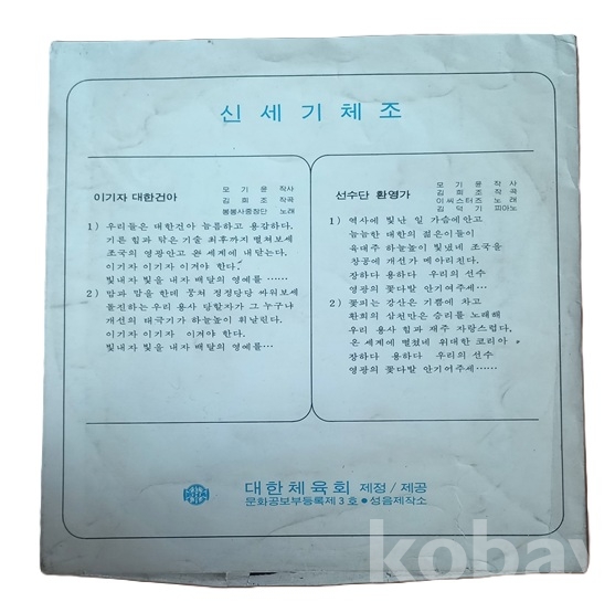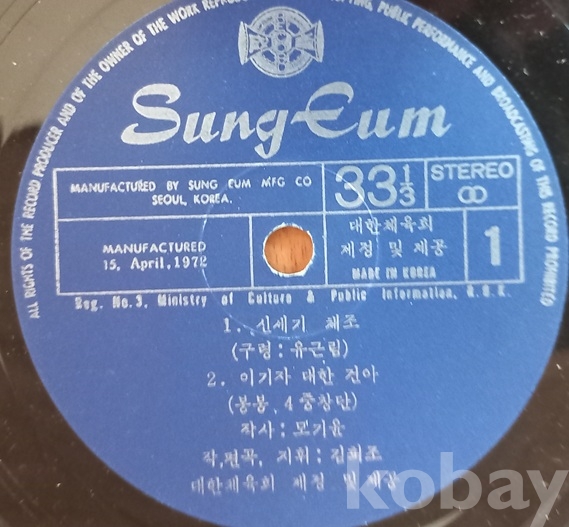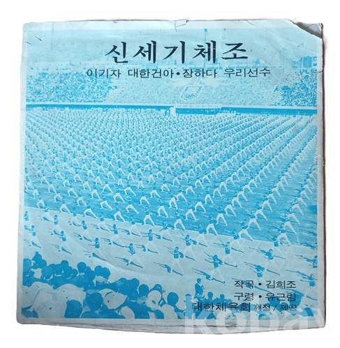 정확한 년도미상? 60년대 후반~ 70년대 초반에 걸쳐 대한체육회에서 제정하고 성음사에서 제작 되었읍니다. 대한체육회-, 어디서 많이 듣던 이름으로 지금도 그 명칭대로가 아닌가 싶습니다. 당시 거기서 국민들에게 체조보급을 위한 홍보용으로 만든것으로 보입니다. 아시겠지만 6.25직전 일본에 의뢰 들어올려던 "라디오 체조"가 6.25 전쟁통으로 무산이 되고 뒤에 재건체조를 비록 여기 신세기체조, 국민체조, 가정체조 등등이 있었지요. 특이하게는 군대에서 하던 국군도수체조 음반도 있었고... 이들 음반들은 이젠 정말 하나같이 구하긴 어렵다하겠지요. 세월이 갈수록 더하겠지요.. 기회에 한점 소장하시는것도 좋지 않을까 생각도 들고.