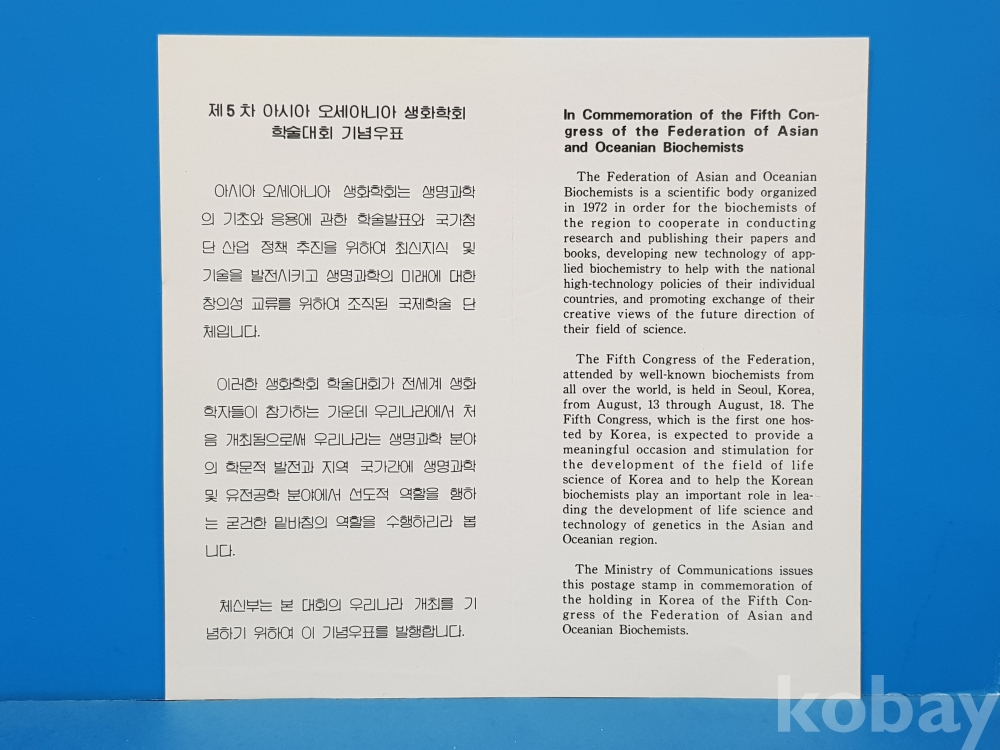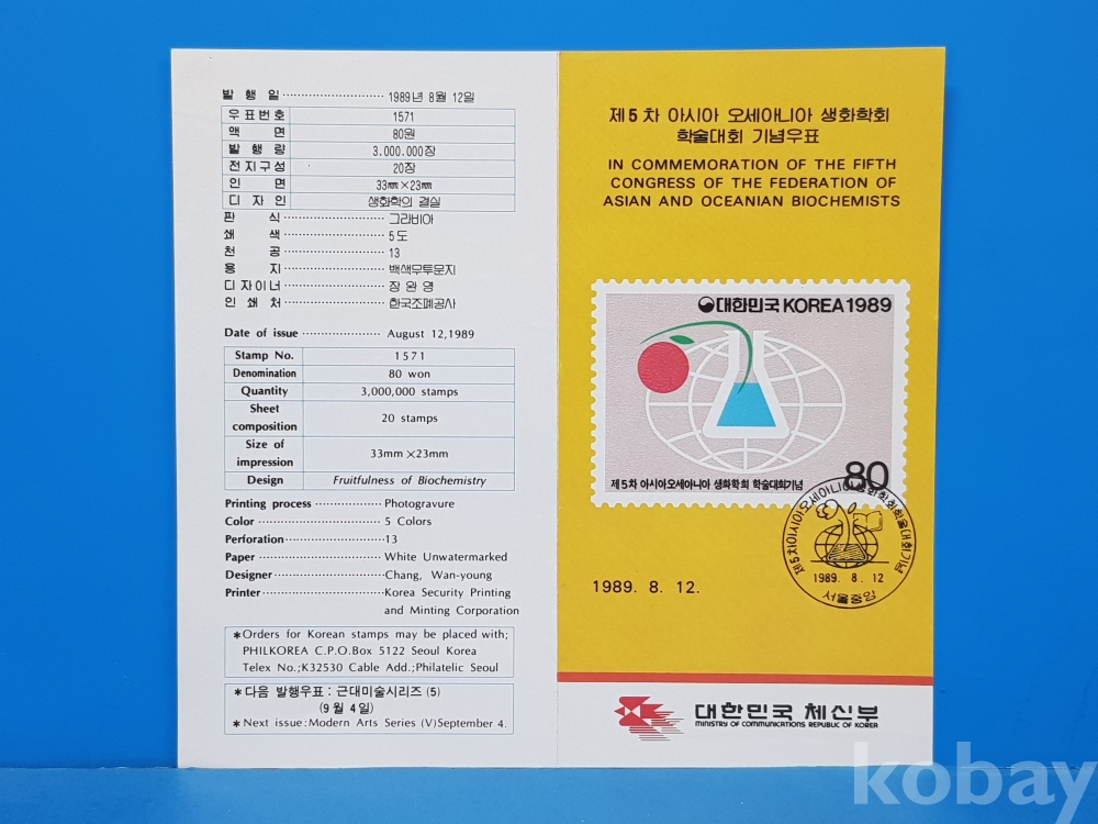 **** 제5차 아시아 오세아니아 생화학회 학술대회 기념우표/1989.8.12/대한민국 체신부*색 변함, 찢김, 접힘 등 있을 수 있음