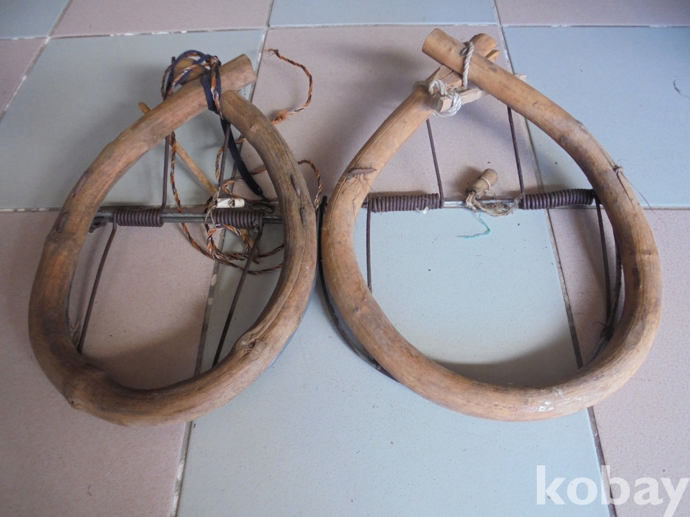근대까지 사용한것으로 보이는 굵은다래나무에 철사스프링 나무뻐퉁개 꿔는막대기 질긴줄등이 질이잘들고 완연한 꿩잡던 꿩틀 2점