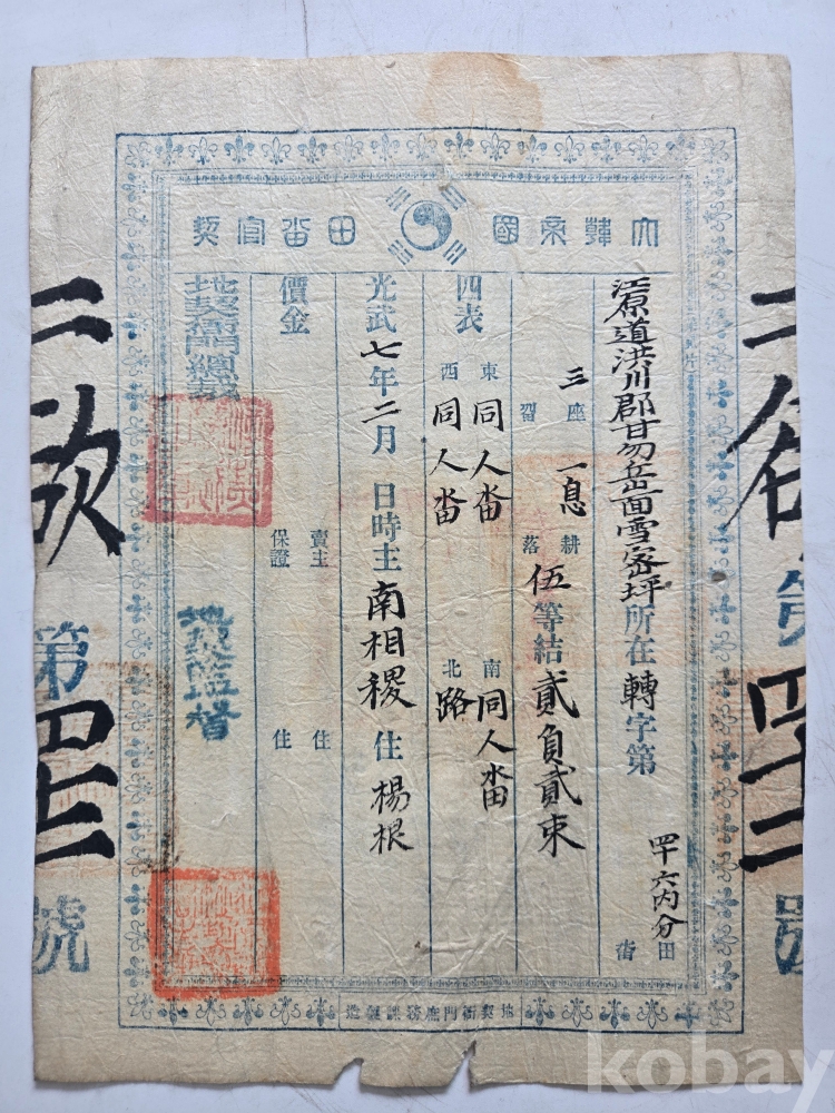 광무 光武七年(1904년)/지계아문(地契衙門)에서 발급한 (강원도 홍천군)/대한제국 전답관계(大韓帝國 田畓官契)