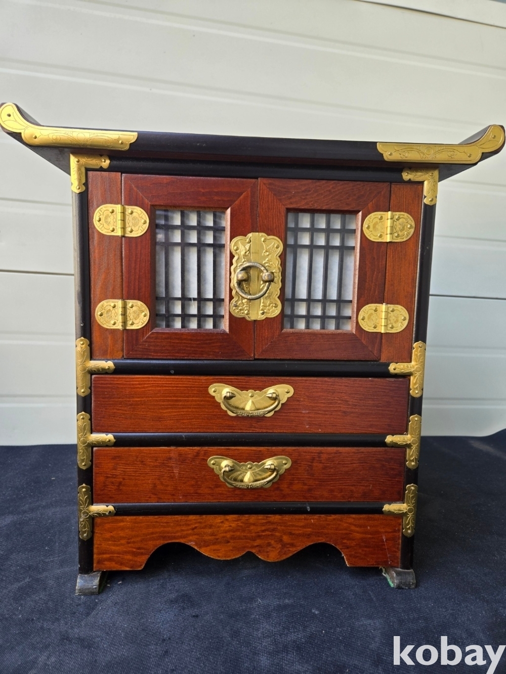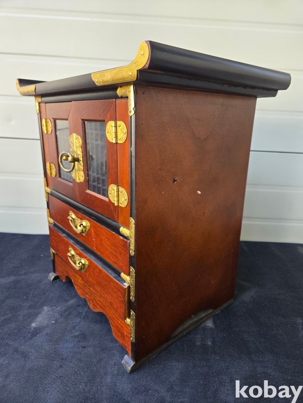 동 장식에 앞닫이, 2칸의 서랍이 있는 장식장 입니다.