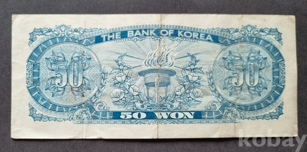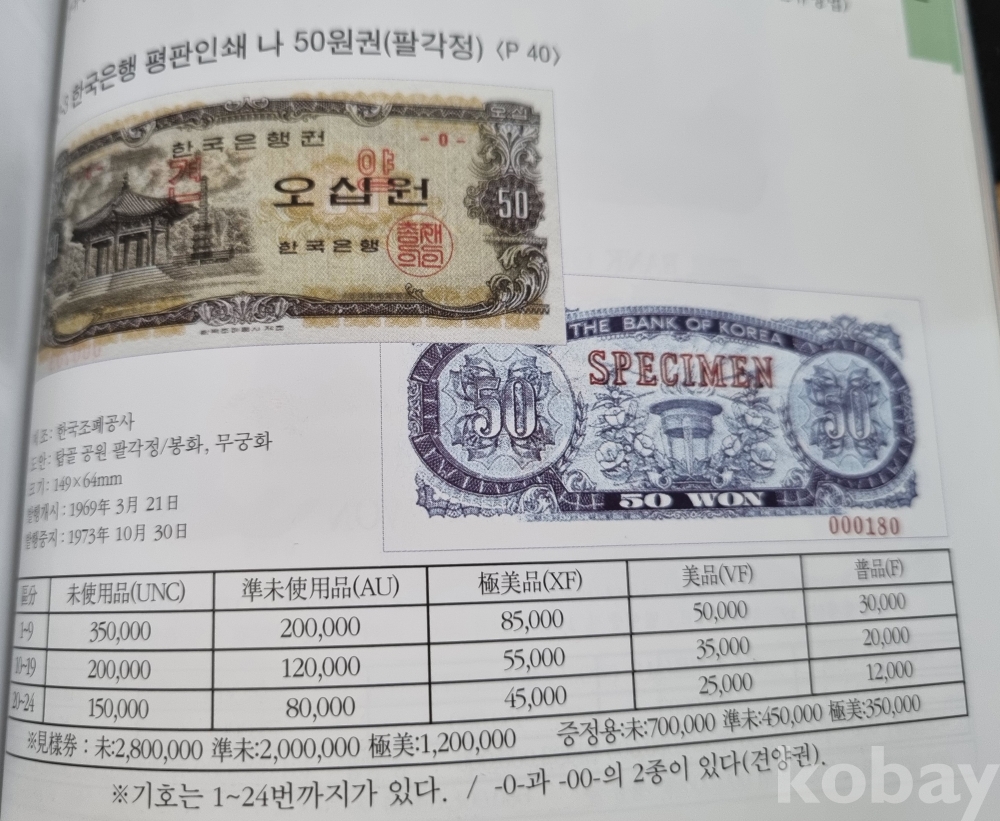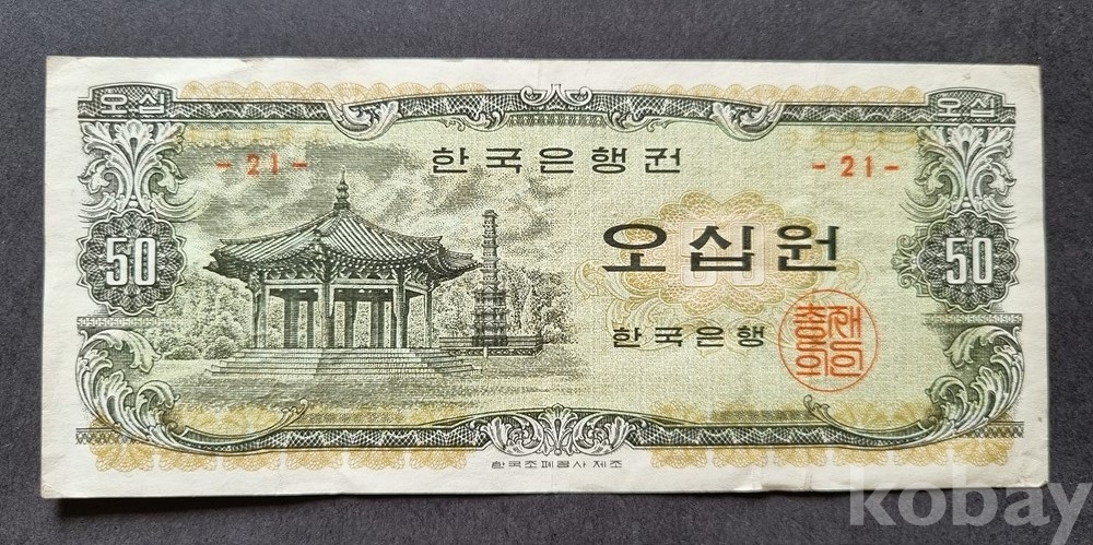 가1-95 / 한국은행권 지폐 "오십원" (탑골공원 팔각정, 봉화 무궁화),발행개시 1969년 3월21일