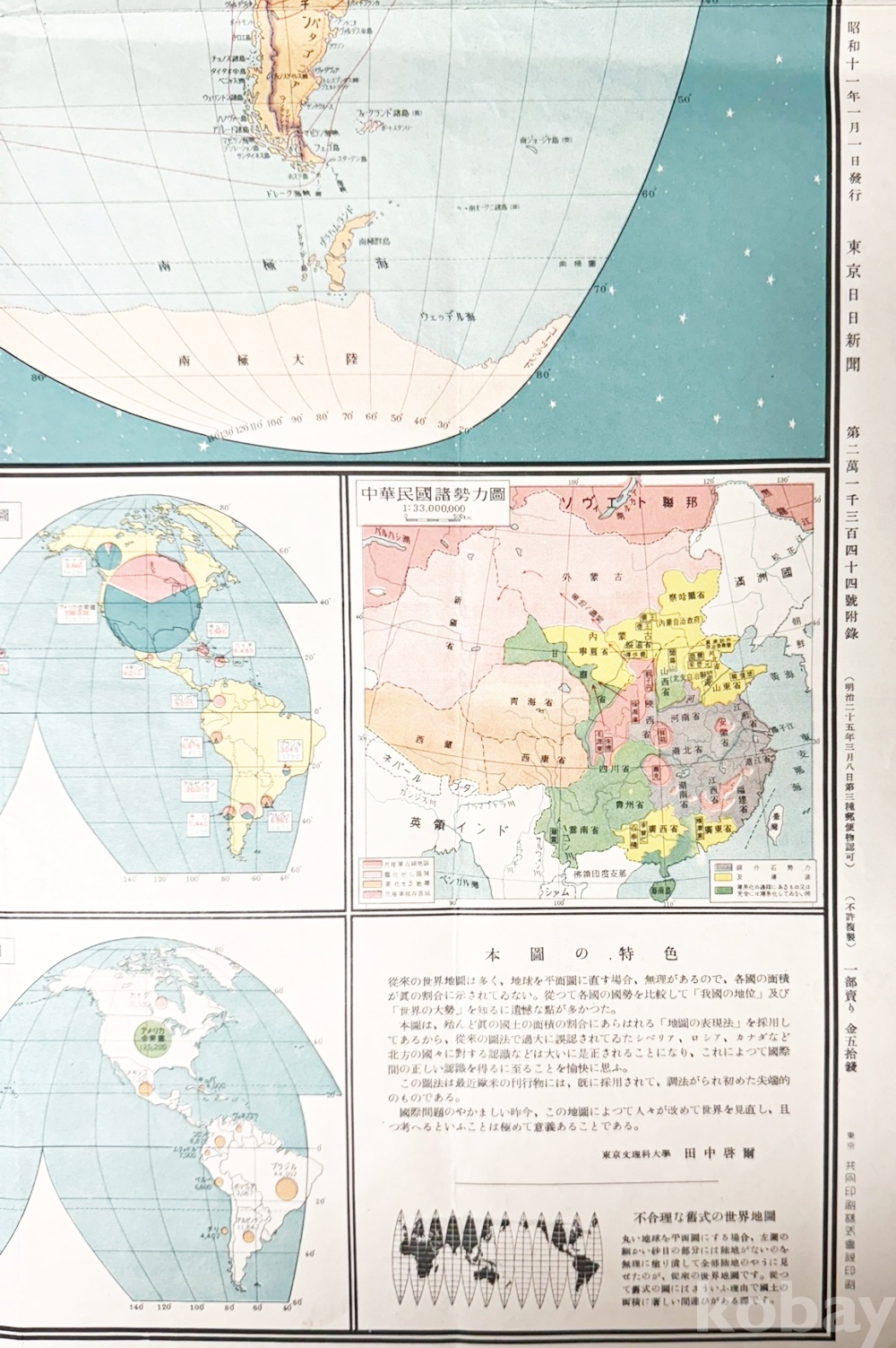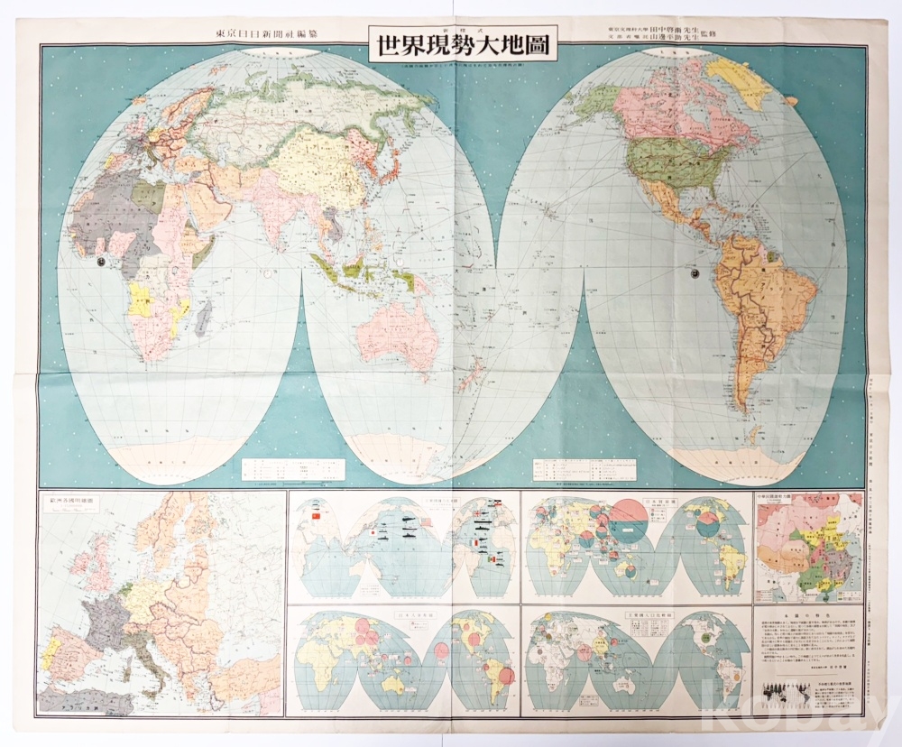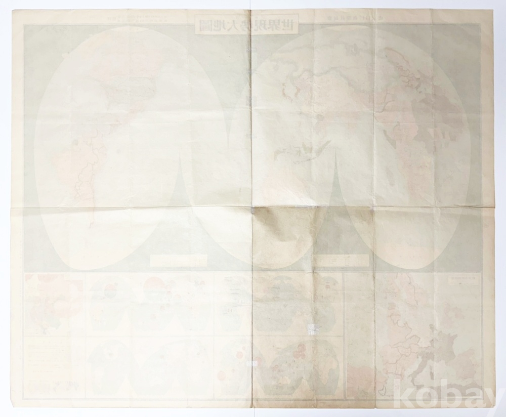 상품 설명 | 1936년 동경일일신문 제21344호의 부록으로 첨부되었던 대형 컬러 지도 ‘세계현세대지도’ 1점이다. 세계 지도가 북반구와 남반구로 나뉘어 표기되어 있으며, 하단에는 각종 도표들이 수록되어 있다. | ||