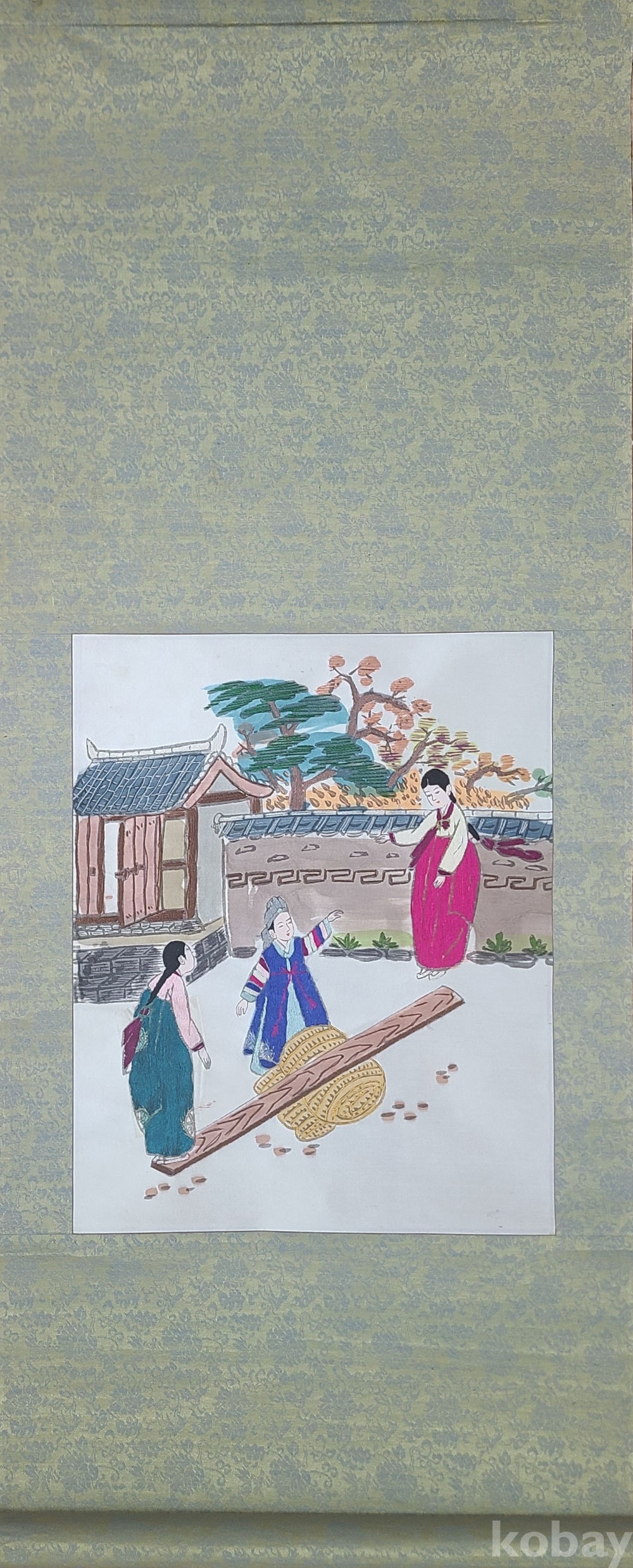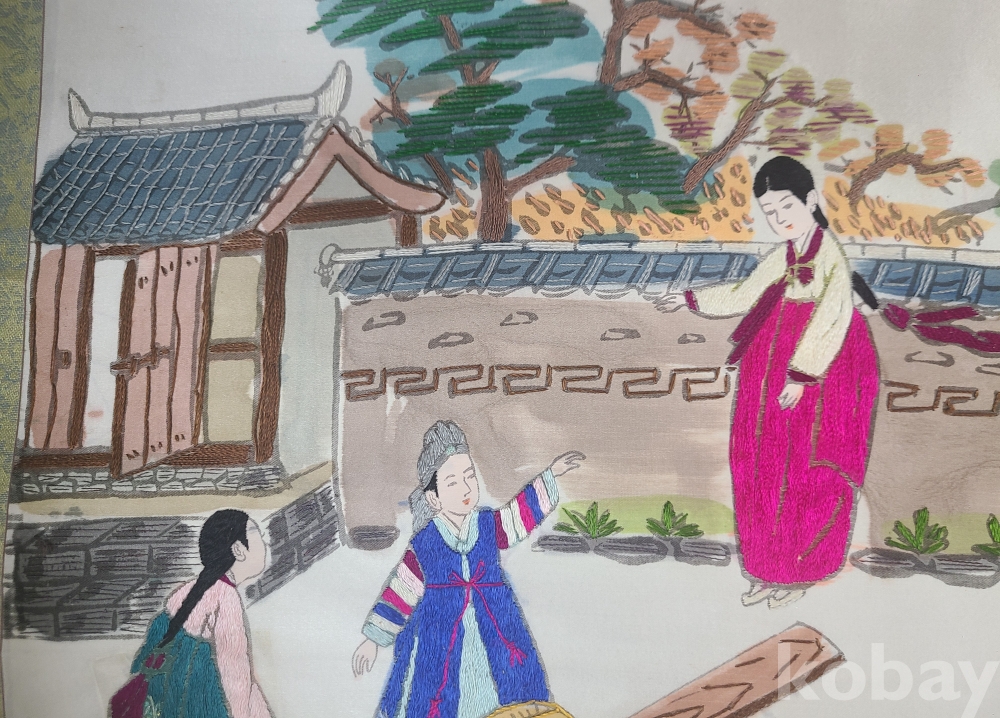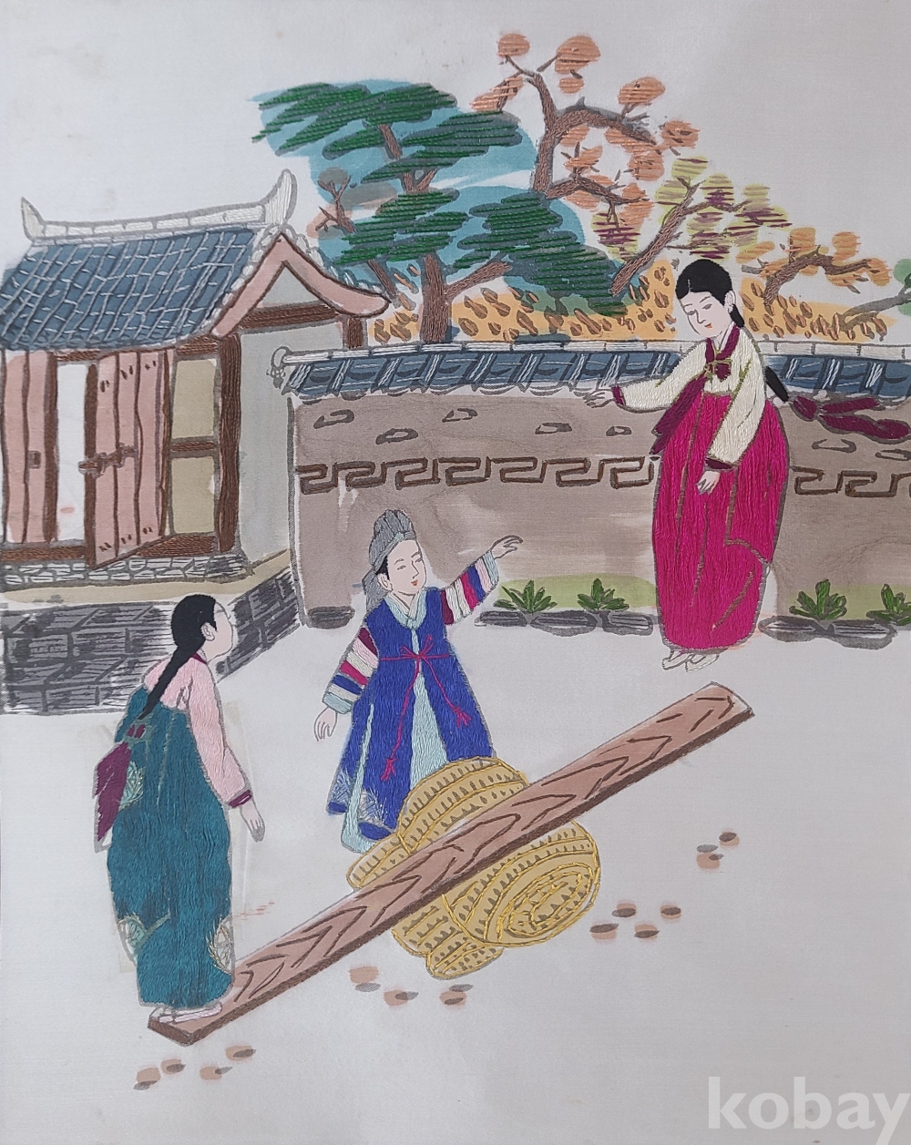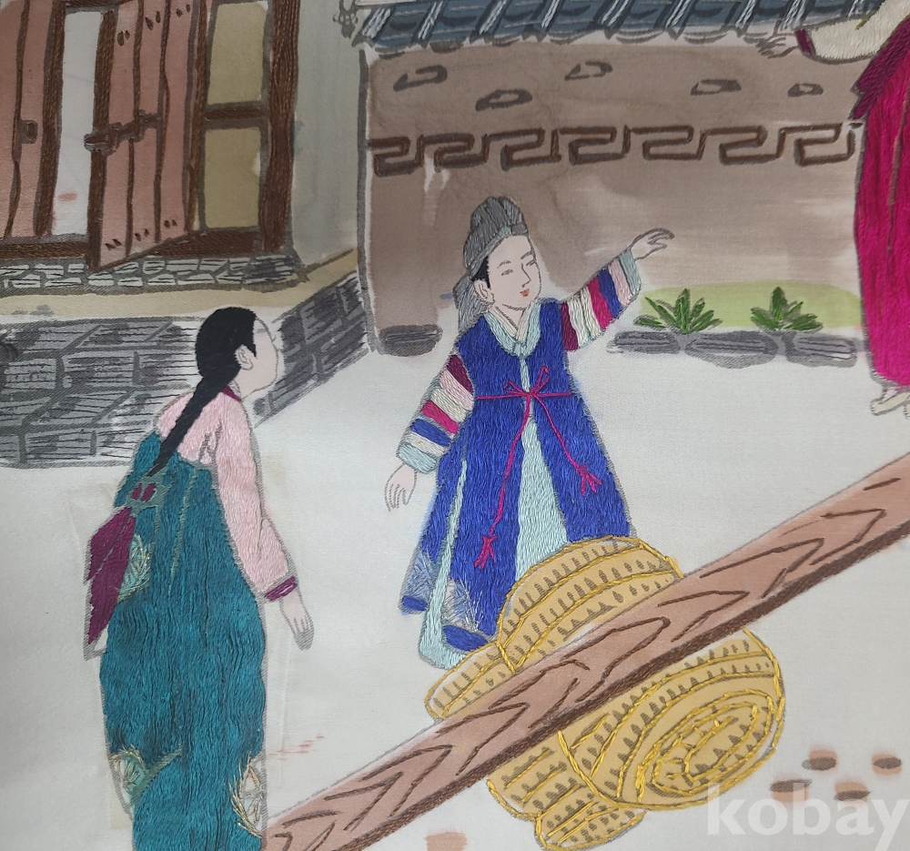 비단에 <널뛰기 모습>을 수놓은 작품
