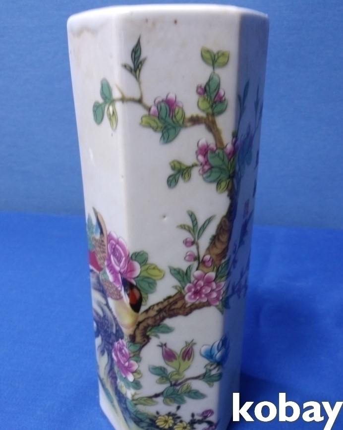 새와 꽃 그림이 도자기 전체에 있는 6각 필통 도자기 입니다.