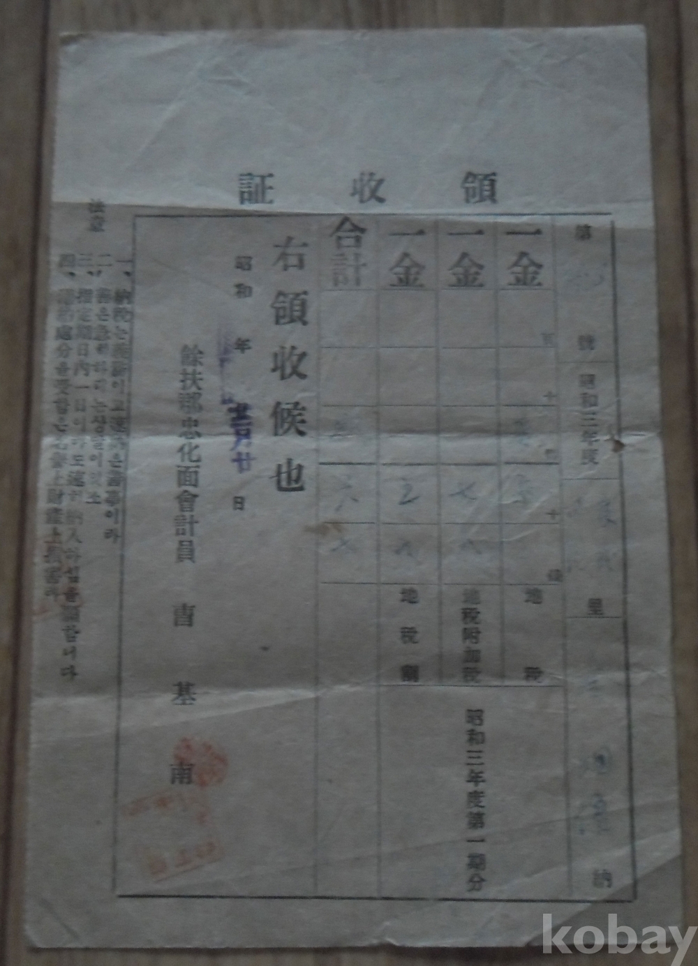 소화3년 부여군충화면 발행 영수증