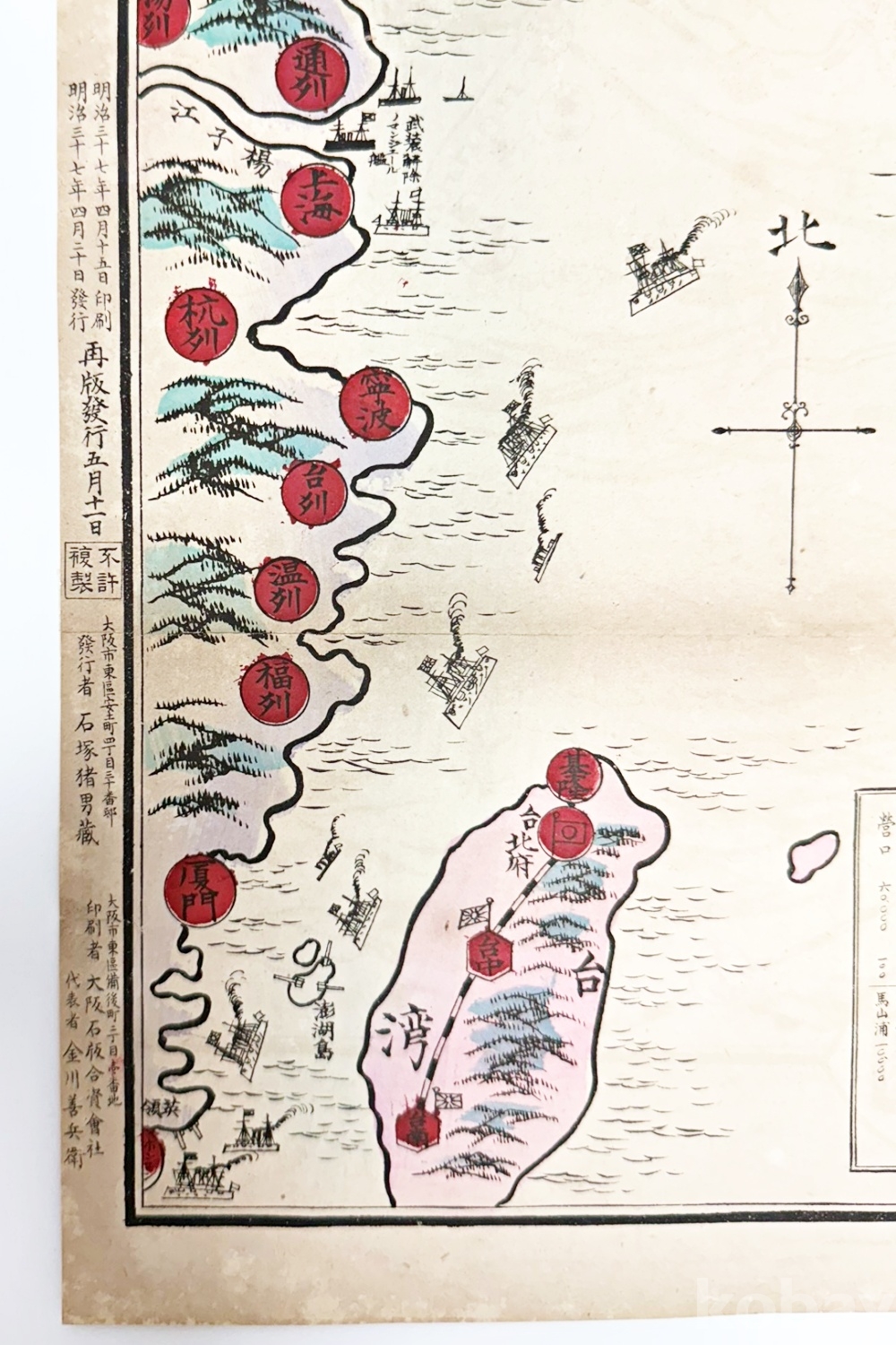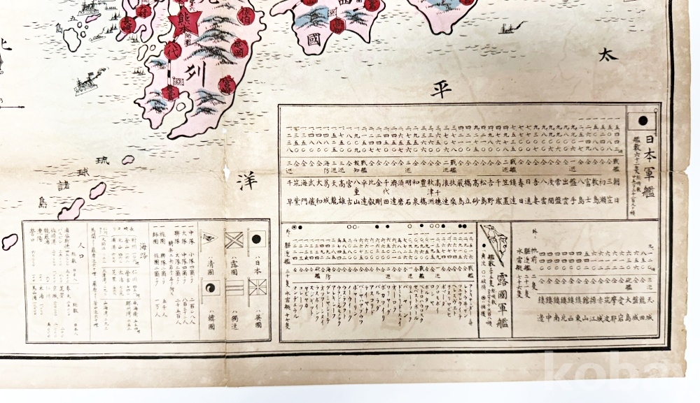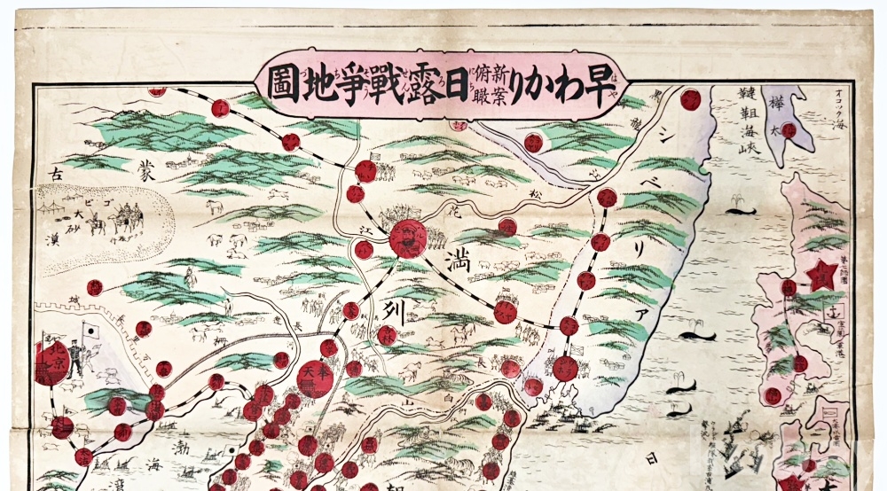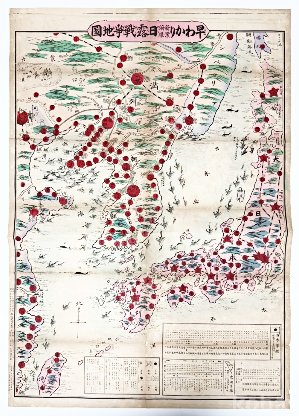 상품 설명 | 1904년 일본 발행, 러일전쟁 당시의 전황을 표기하고 있는 ‘일러전쟁지도’ 1점이다. 전쟁에 참여한 일본과 러시아의 군함 숫자, 침몰된 러시아 함선의 위치 등을 삽화를 가미하여 표기하였다. | ||