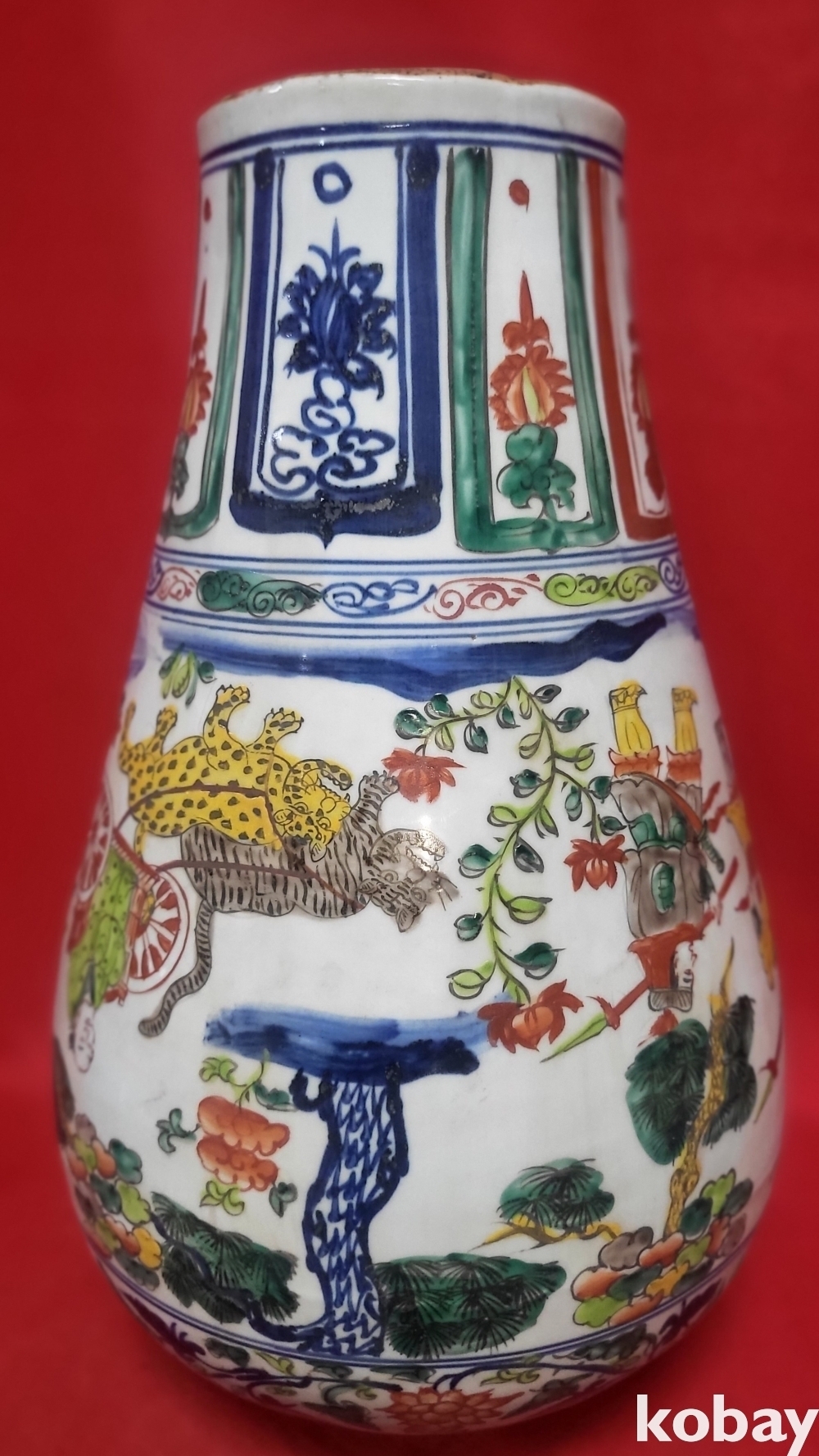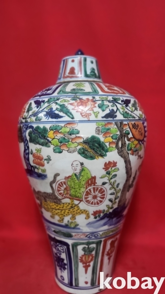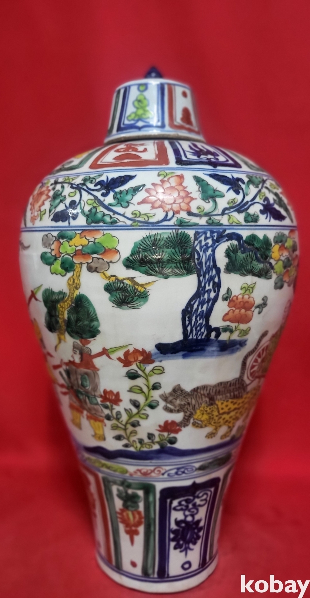 대원국지정8년 추월길일 장문진 조(張文進 造) 관지 오채 귀곡자하산도문양 뚜껑있는 매병입니다,