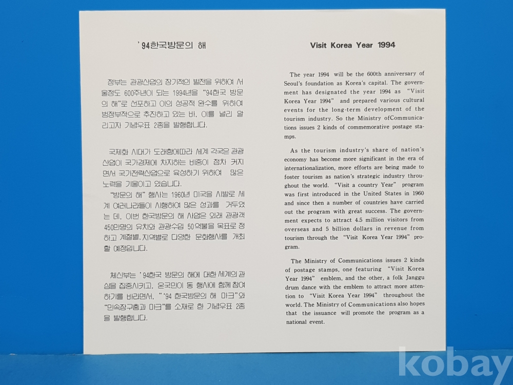 **** '94한국방문의 해/1993.9.27/대한민국 체신부*색 변함, 찢김, 접힘 등 있을 수 있음