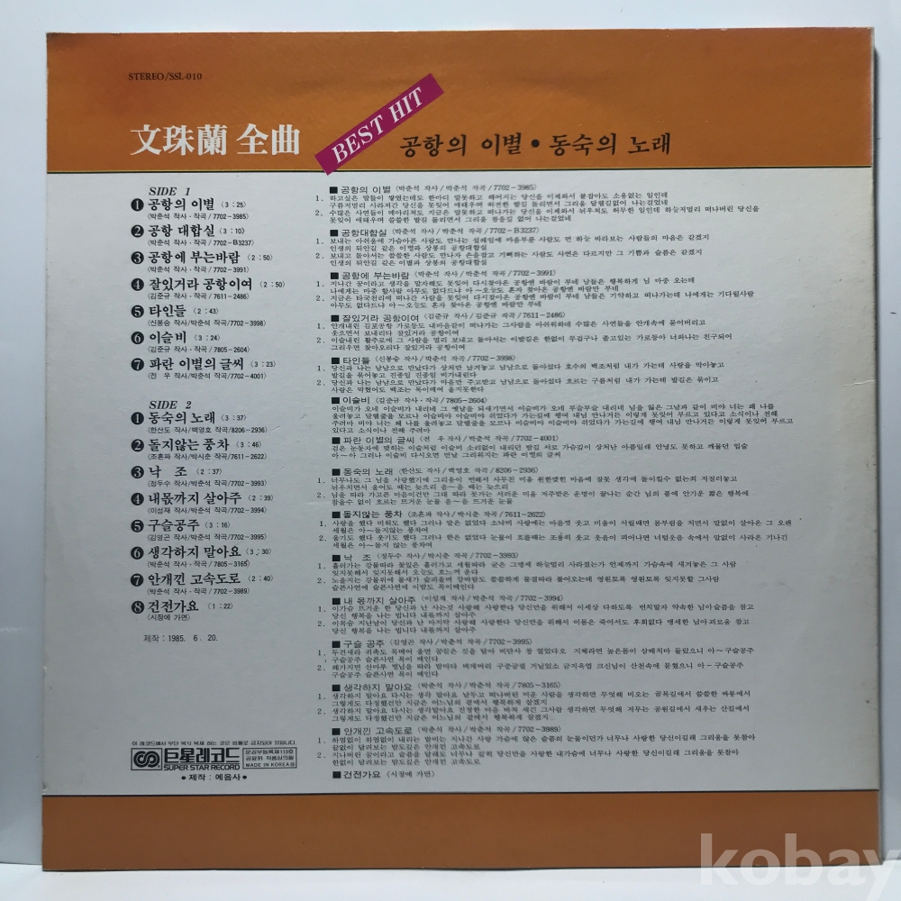 LP 34,700-99 문주란 베스트 히트 - 공항의 이별 _ ` 85 거성 자켓 EX+ 알판 NM