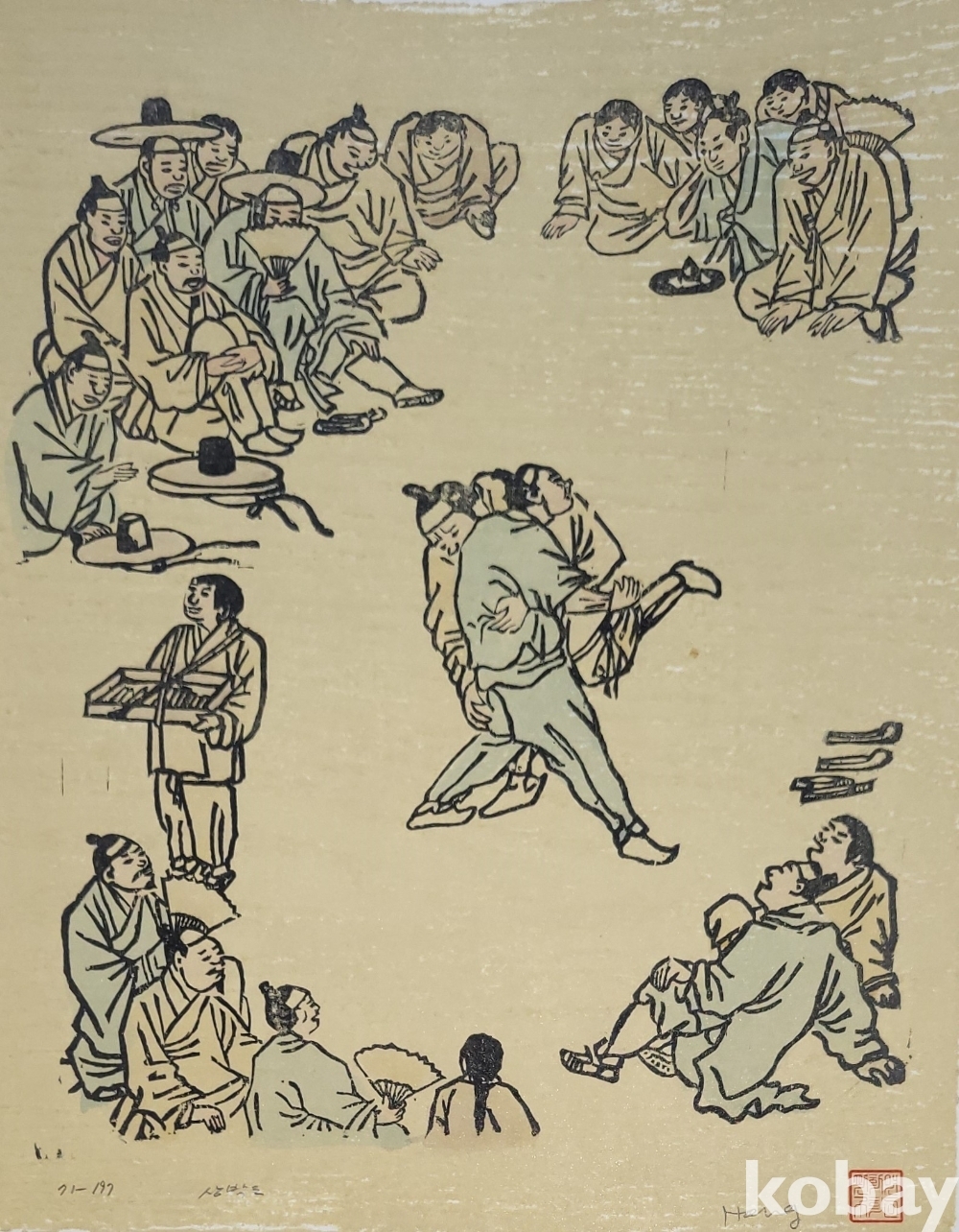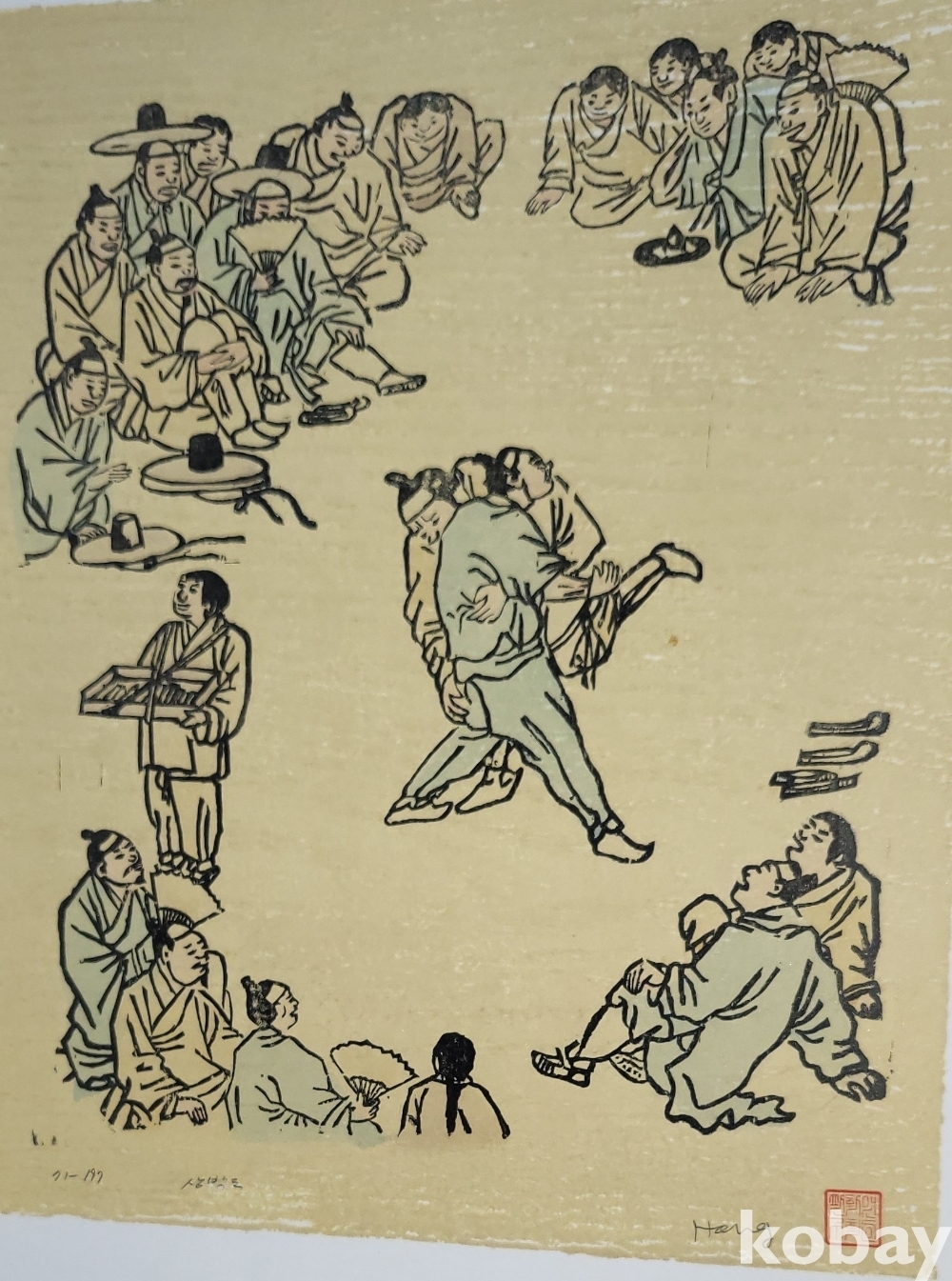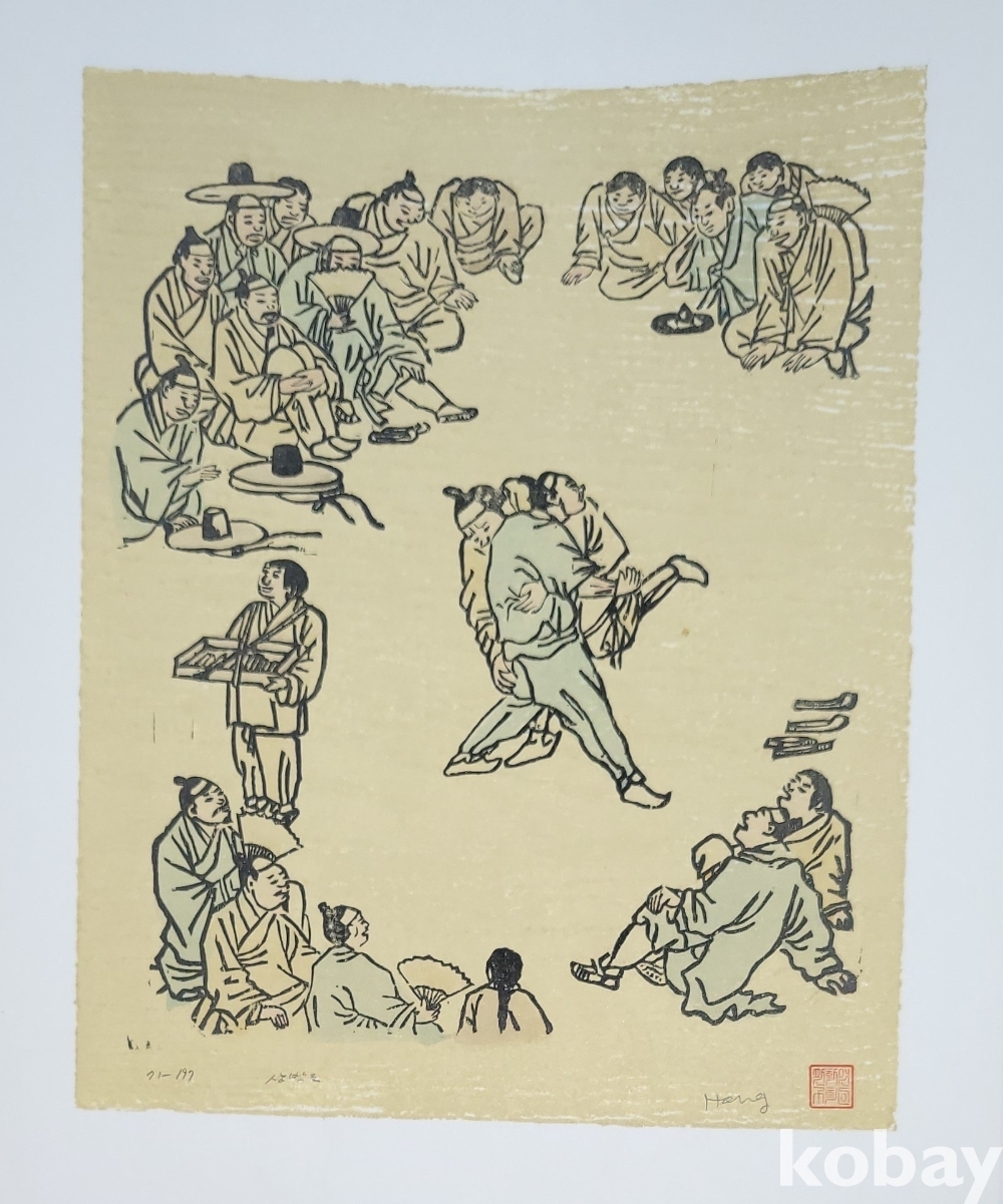 한국풍속판화로 1972년 한국판화 박물관에서 제작한 단원 김홍도 " 씨름도"목판화입니다,
