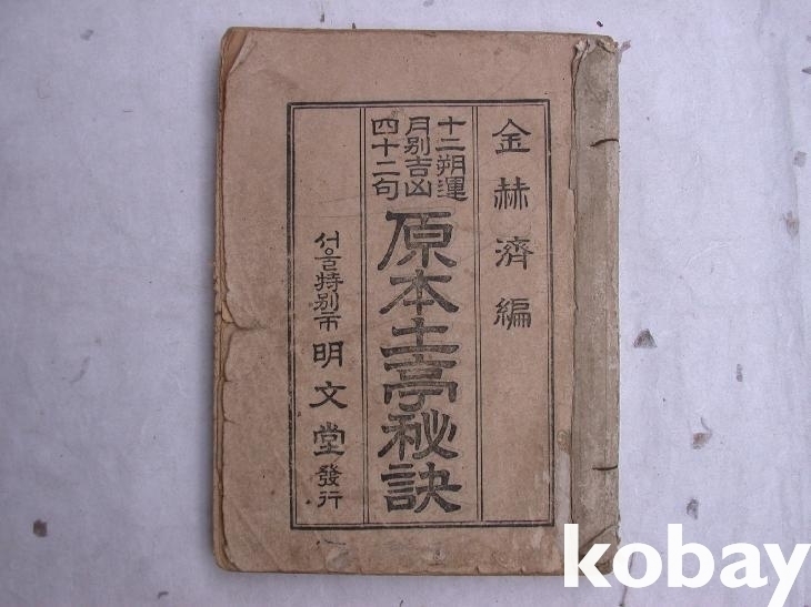 ▒ 단기4287년(1954년) 명문당에서 발행한 김혁제 편, <十二朔運/月別吉凶/四十二句 原本 土亭秘訣>이다. 간기는 산실되고 없으나 잔존하는 뒷표지에 연도가 보이는 고무인이 있다. 뒷표지는 다른 종이로 덧대어 놓았다.