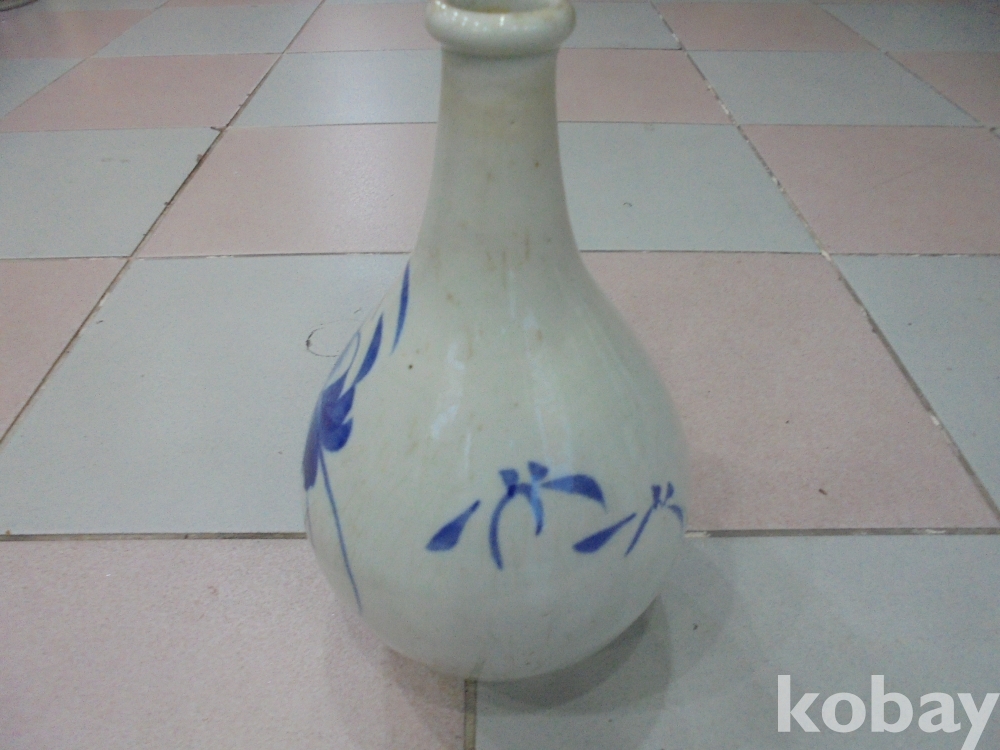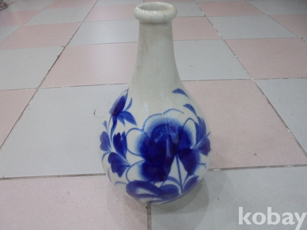 왜정시대 전후하여 잘살던집에서 혼례식 주병으로 많이사용한 오래된 자연빙열의 백자청화 가락지 목단 고급주병