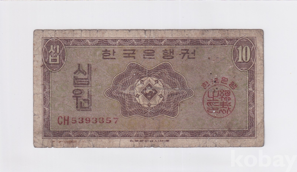 - 한국은행 1962년 영제 십원 CH기호 사용제 지폐