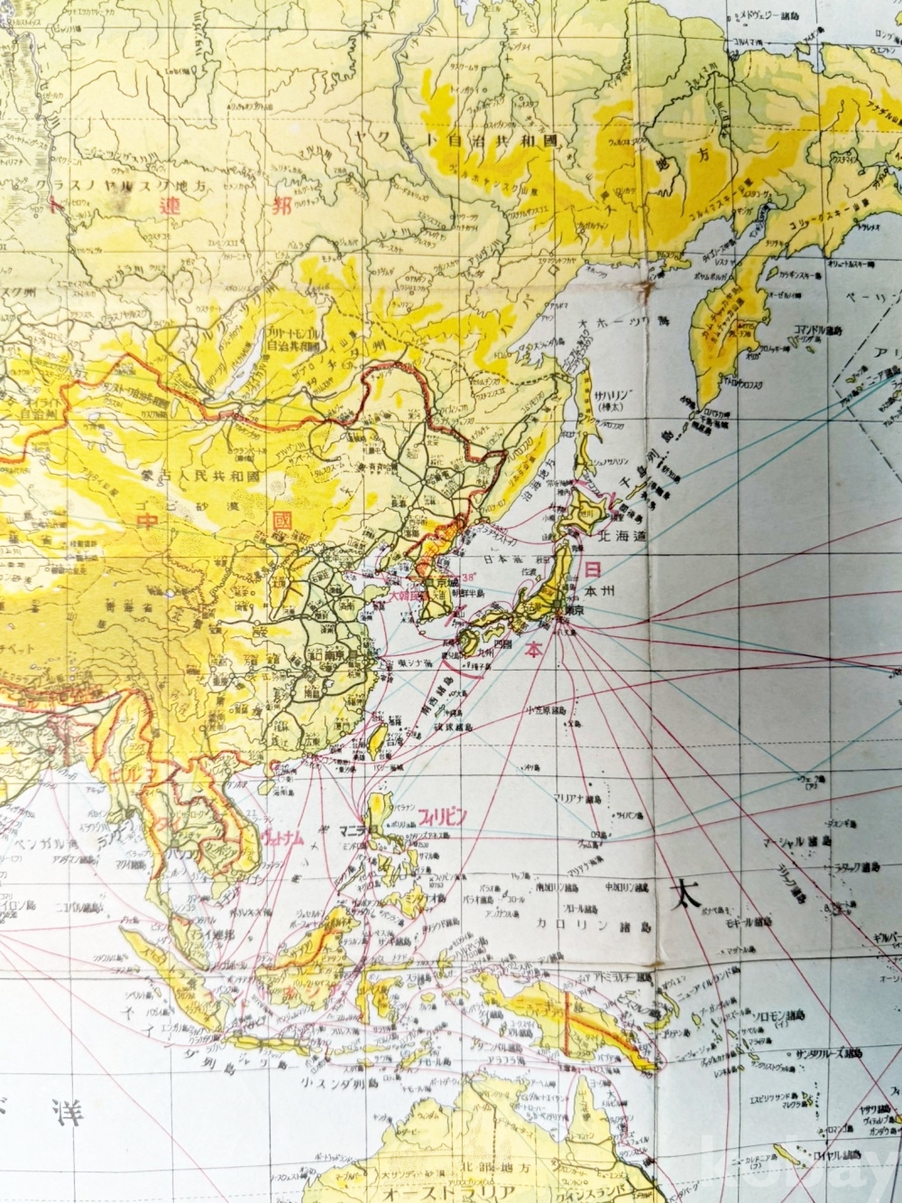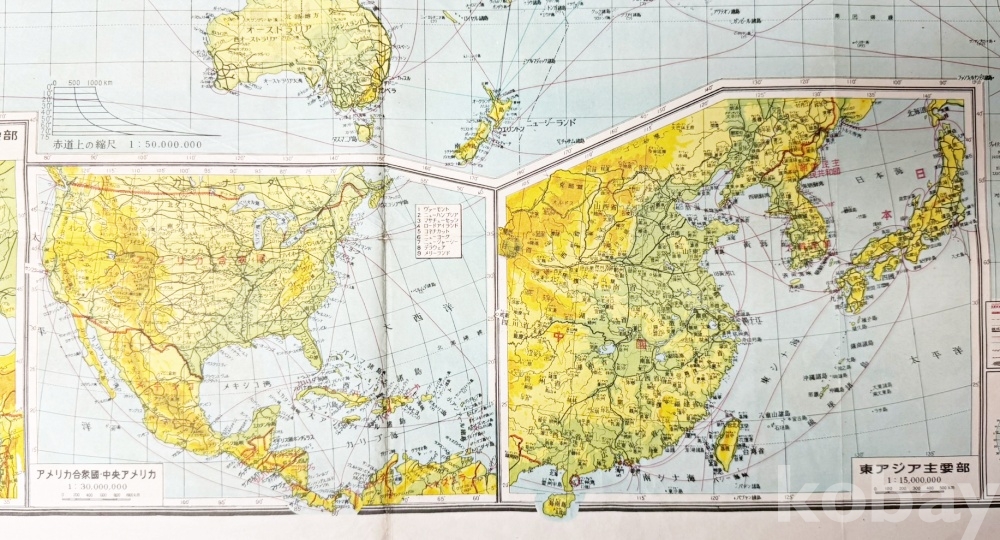 상품 설명 | 1950~60년대 발행 추정, 대일본웅변회강담사(大日本雄弁會講談社)에서 발행한 컬러 세계 지도 1점이다. | ||