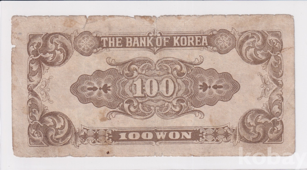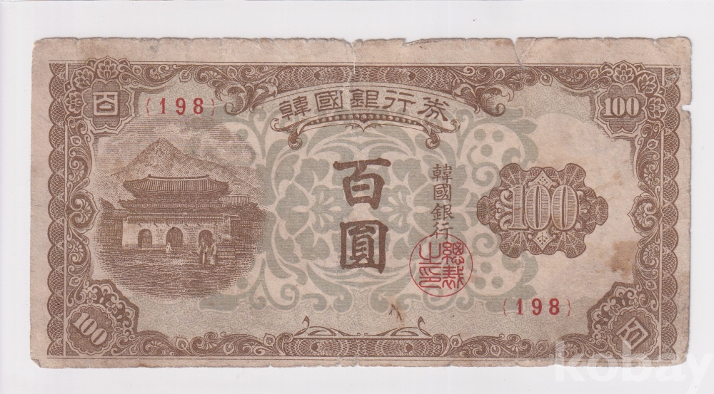 - 한국은행 1950년 광화문 백원 판번호 198번 사용제 지폐