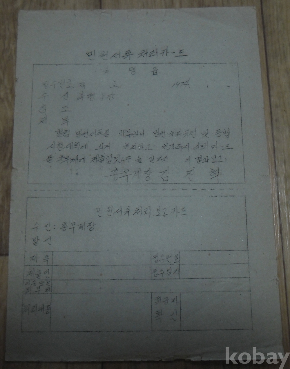 미사용 서식: 1974년 북평읍 민원서류 처리카드
