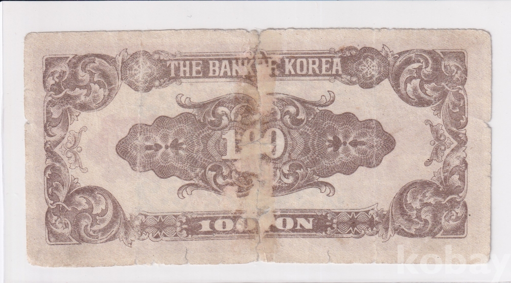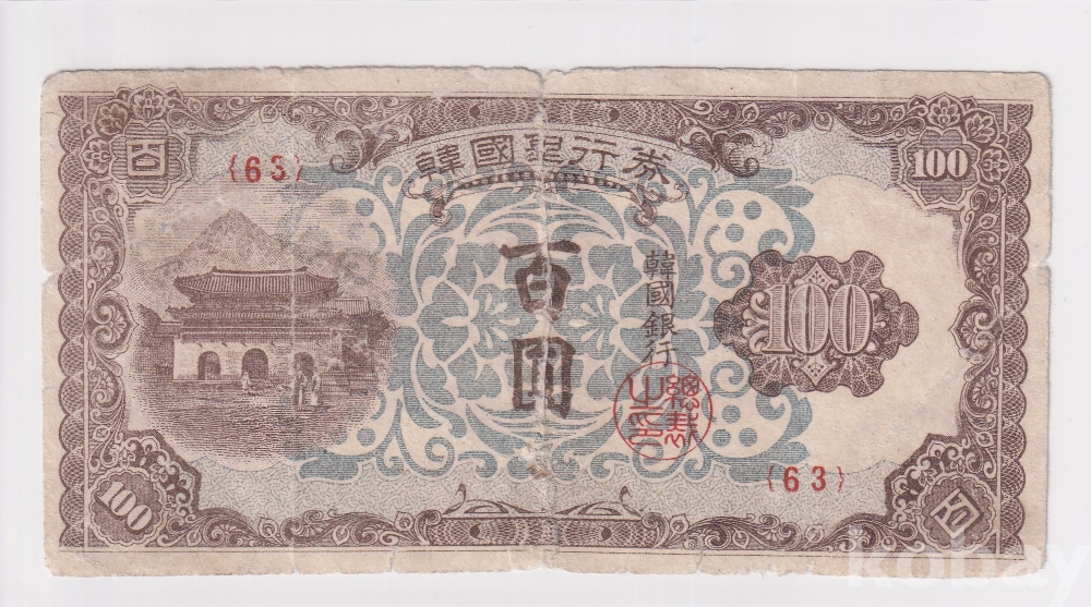 - 한국은행 1950년 광화문 백원 판번호 63번 사용제 지폐