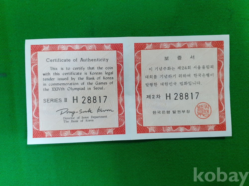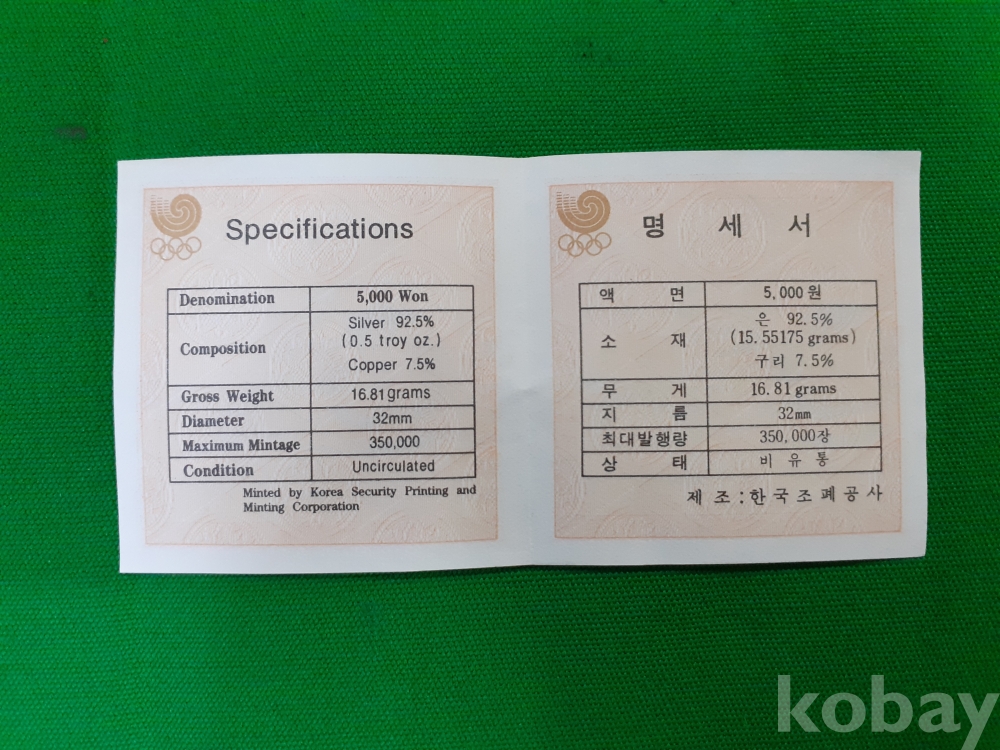 {은화 92.5%} 제24회 1988년 서울 올림픽 5,000원 기념 주화 / 한국은행 (1번)