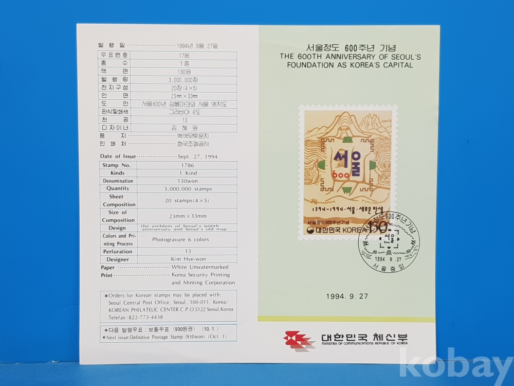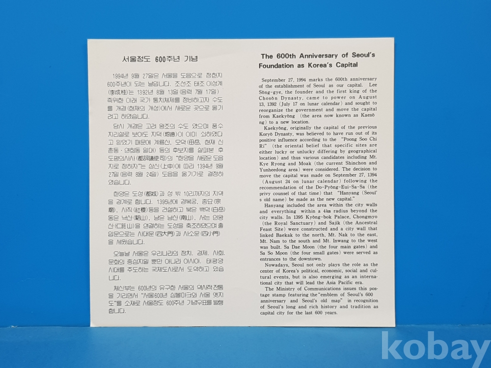 **** 서울정도 600주년 기념/1994.9.27/대한민국 체신부*색 변함, 찢김, 접힘 등 있을 수 있음