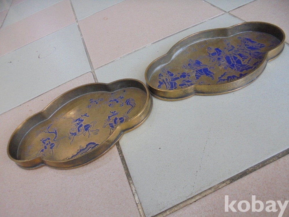 유기수반바닦에 음각한 파란색의 여러명의 신선이있는 중간볼록하여 수석받침대로 좋은 예술적인 유기 수석받침대