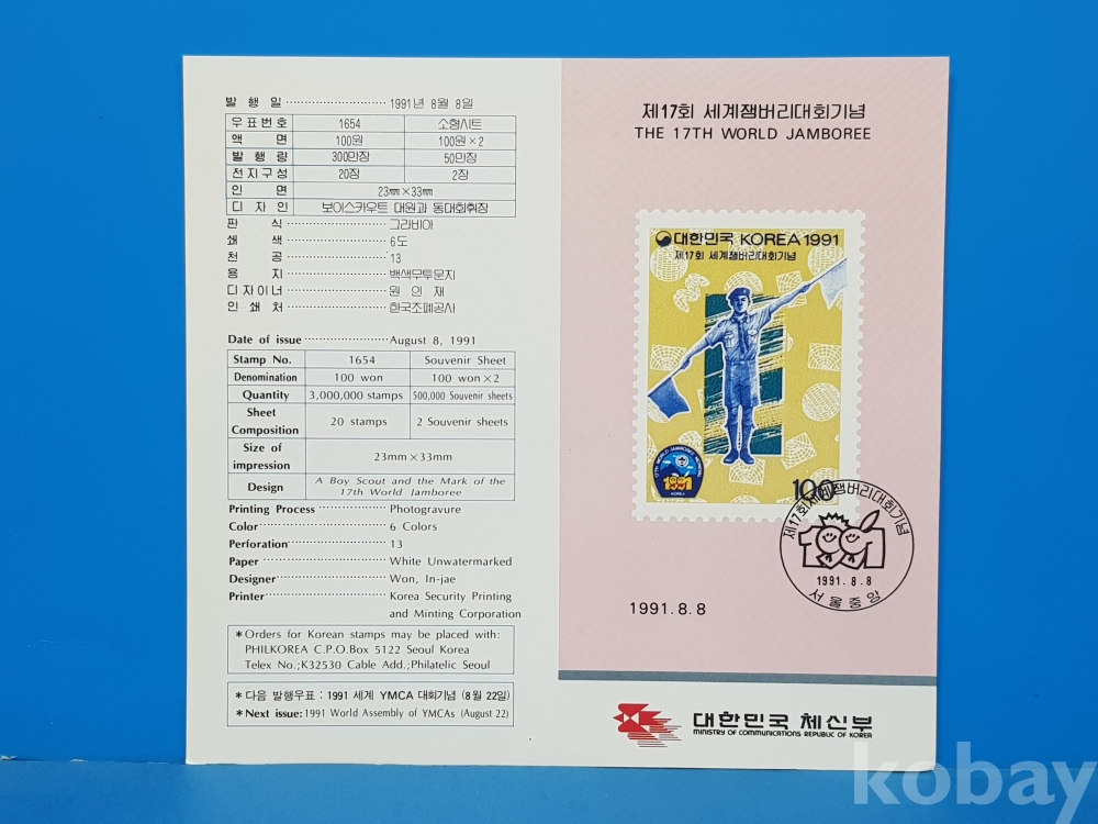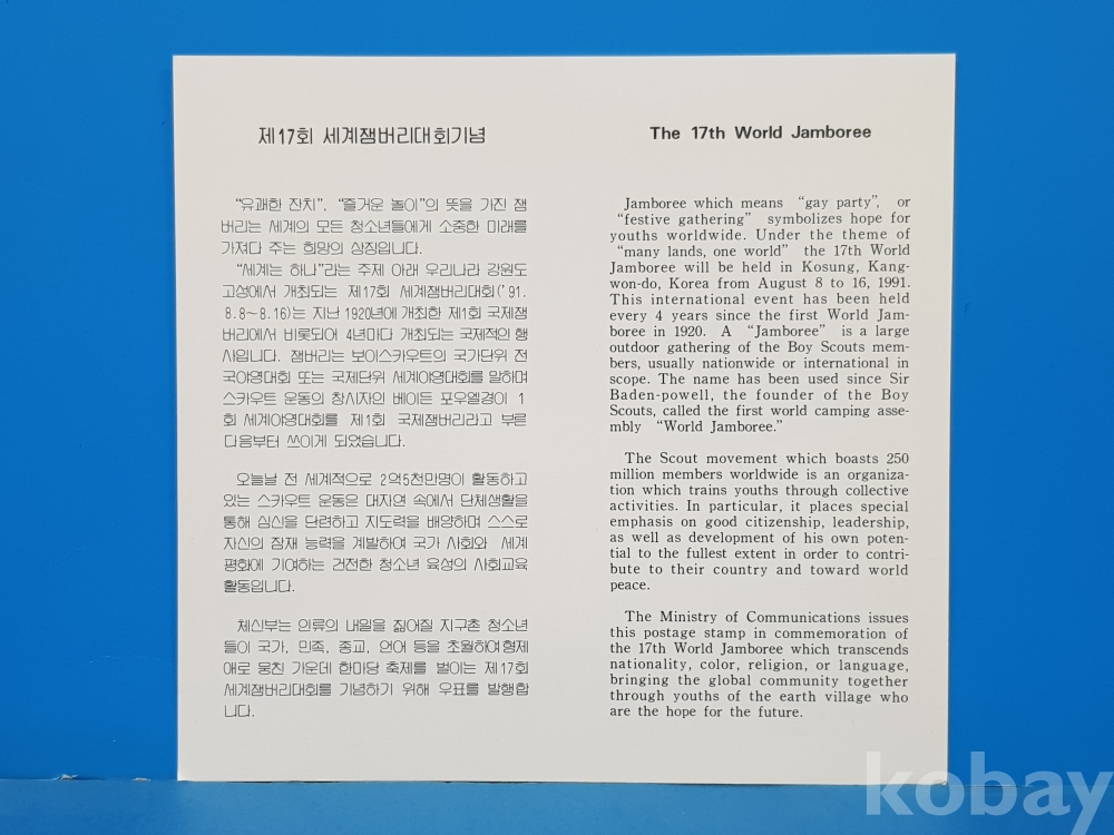 **** 제17회 세계잼버리대회기념/1991.8.8/대한민국 체신부*색 변함, 찢김, 접힘 등 있을 수 있음