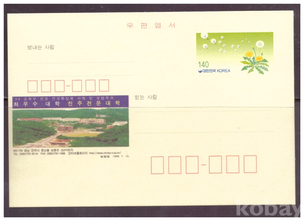(광고엽서) 1999.7.15 지방판 LAPC319 진주전문대학 (민들레 140원)