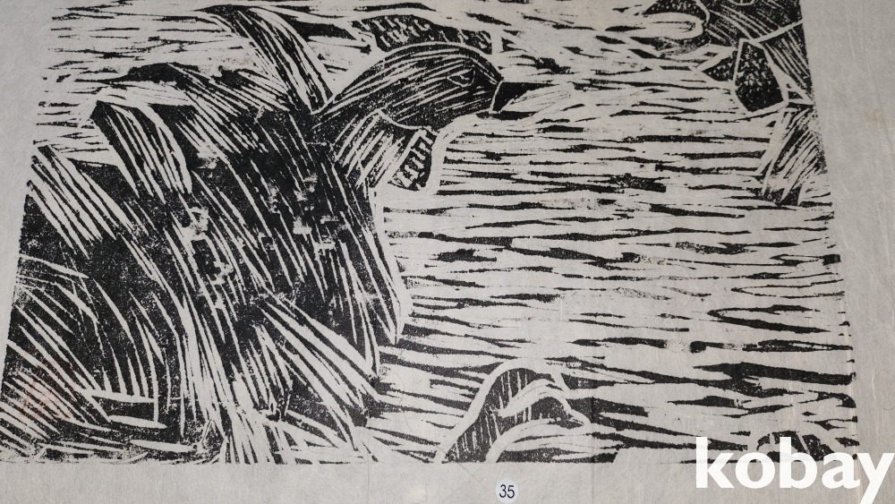수근 사인이 보이는 "두마리의 새"목판화입니다,