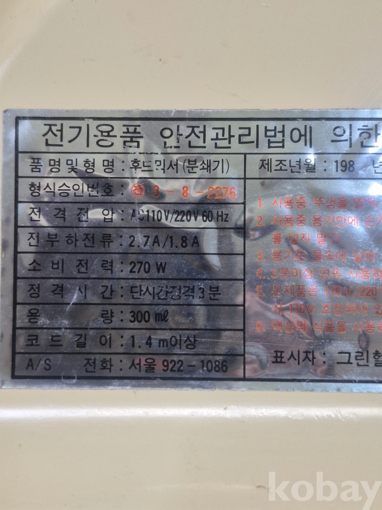 1980년 그린헬스 전자 믹서기 분쇄기 정상작동 메이드 인 코리아 16*16*30