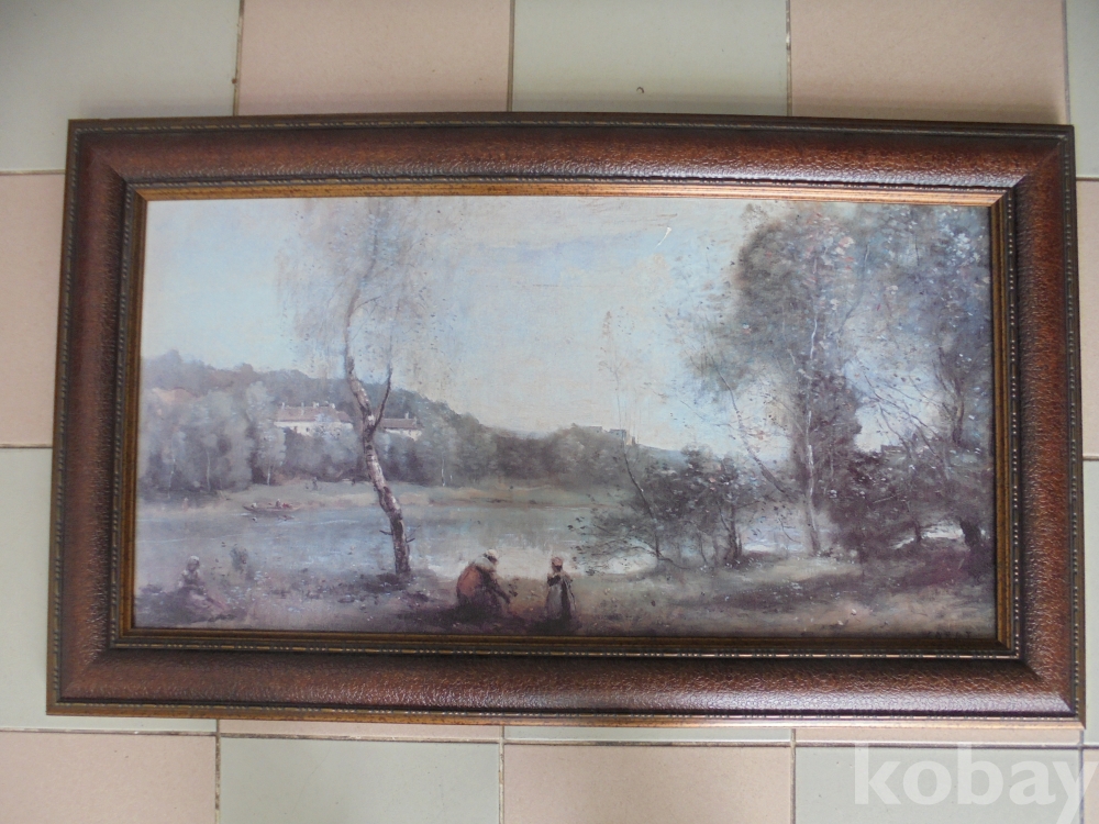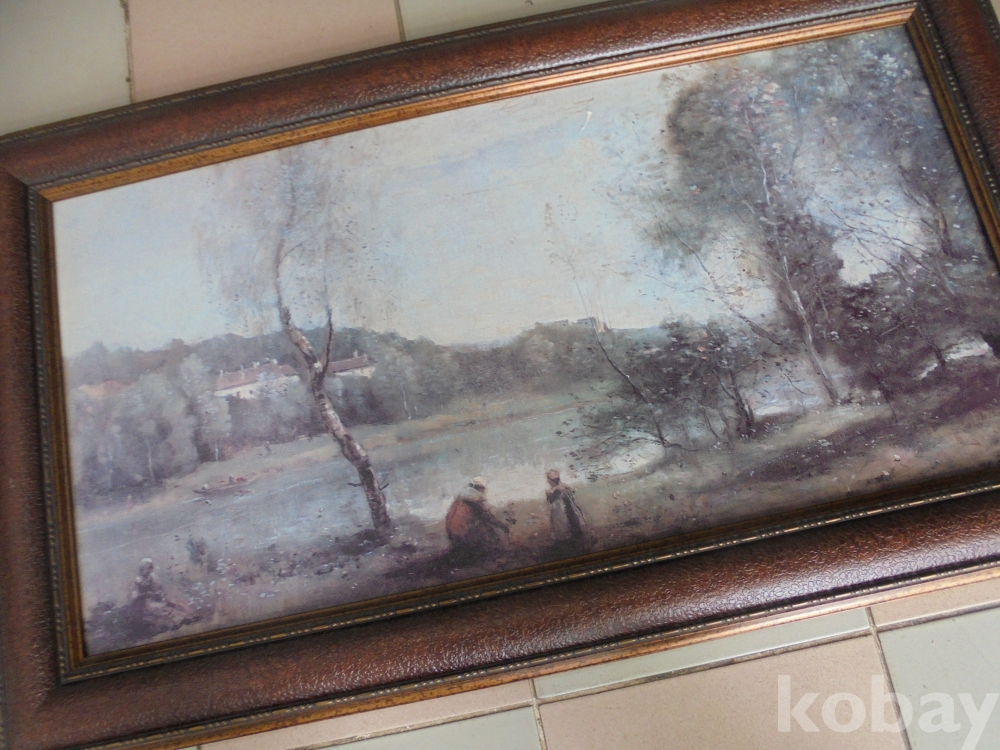 오래되여 영적으로 깊고 은은한 강가의 나무와 여인 집도보이는 명화같은 전부나무로 고급액자로만든 오래된 수준높은 유화와 액자