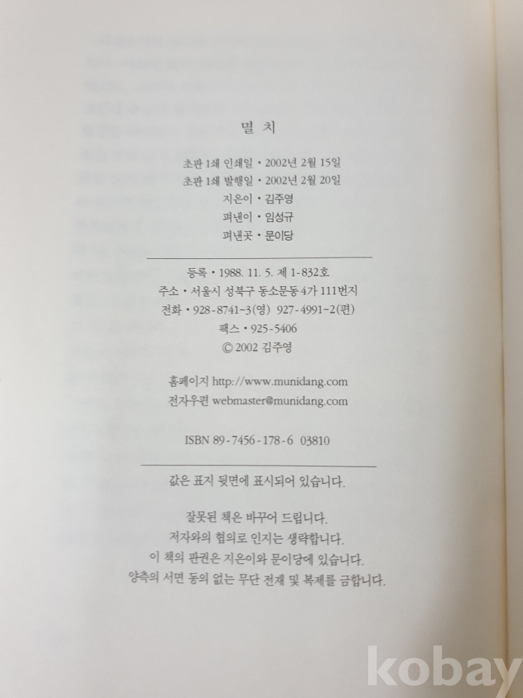 {천원경매} Y-9.2489 (도서) 김주영 장편소설 멸치 (5권이상 묶음배송불가)