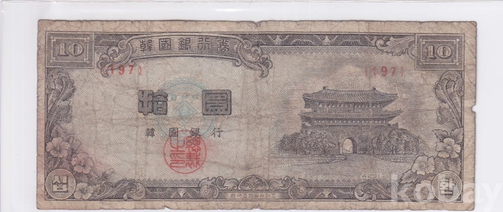 - 4291년(1958년) 남대문 신 십환 백색지 판번호 197번 사용제 지폐