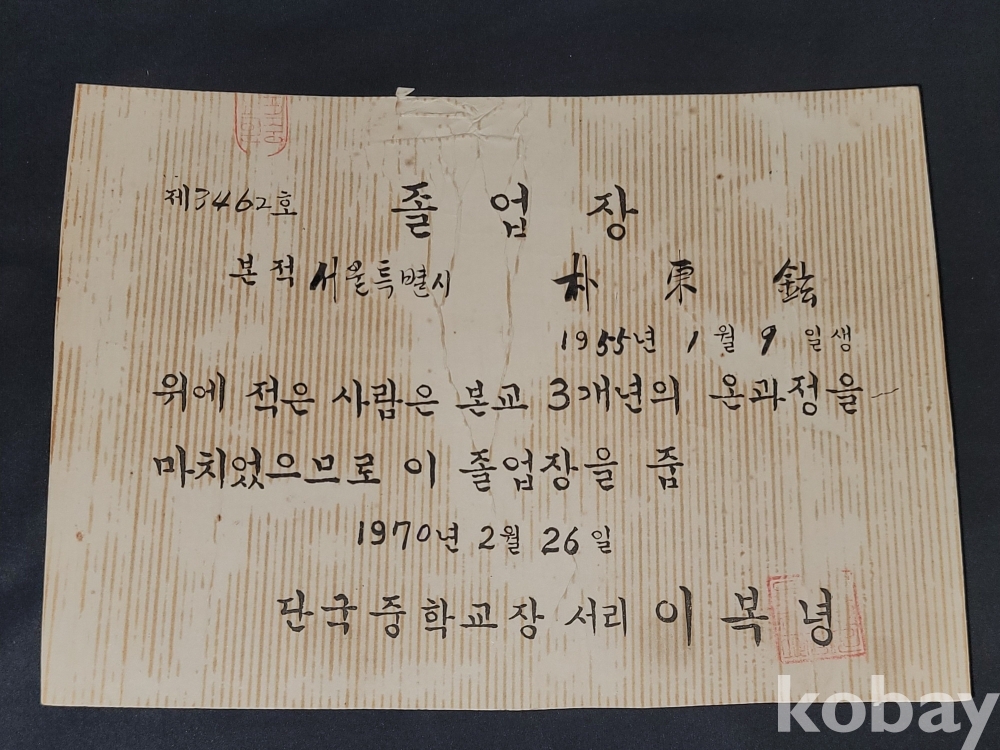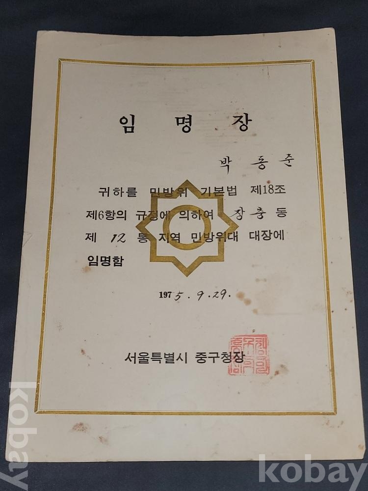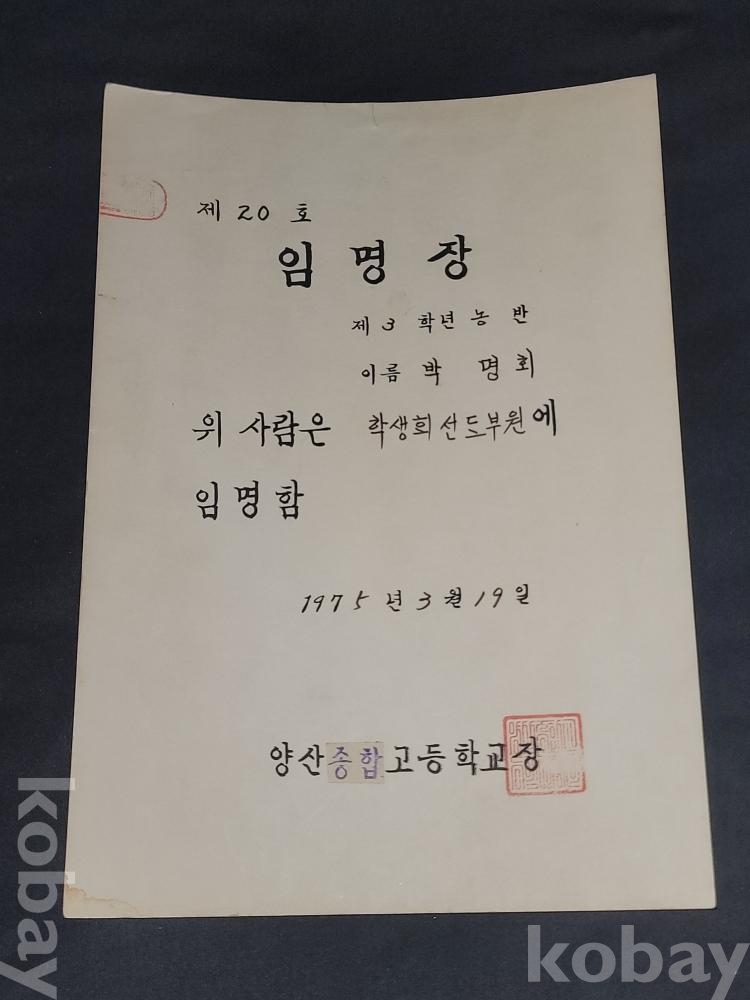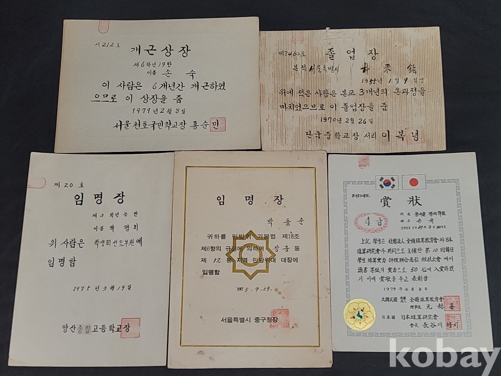 빈티지 세월 감이 느껴지는 1970년 단국중학교 졸업장, 1975년 민방위대 대장 임명장, 1975년 양산종합고등학교 선도부 임명장, 1979년 주산 관련 상장