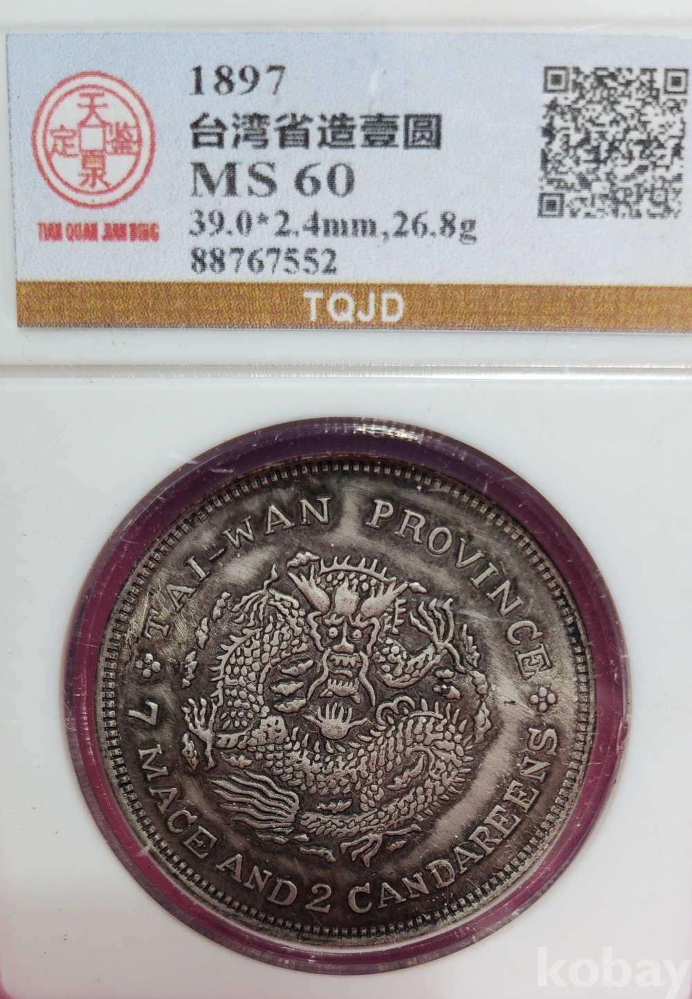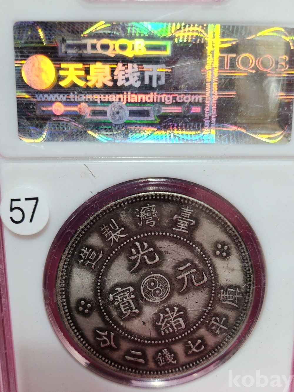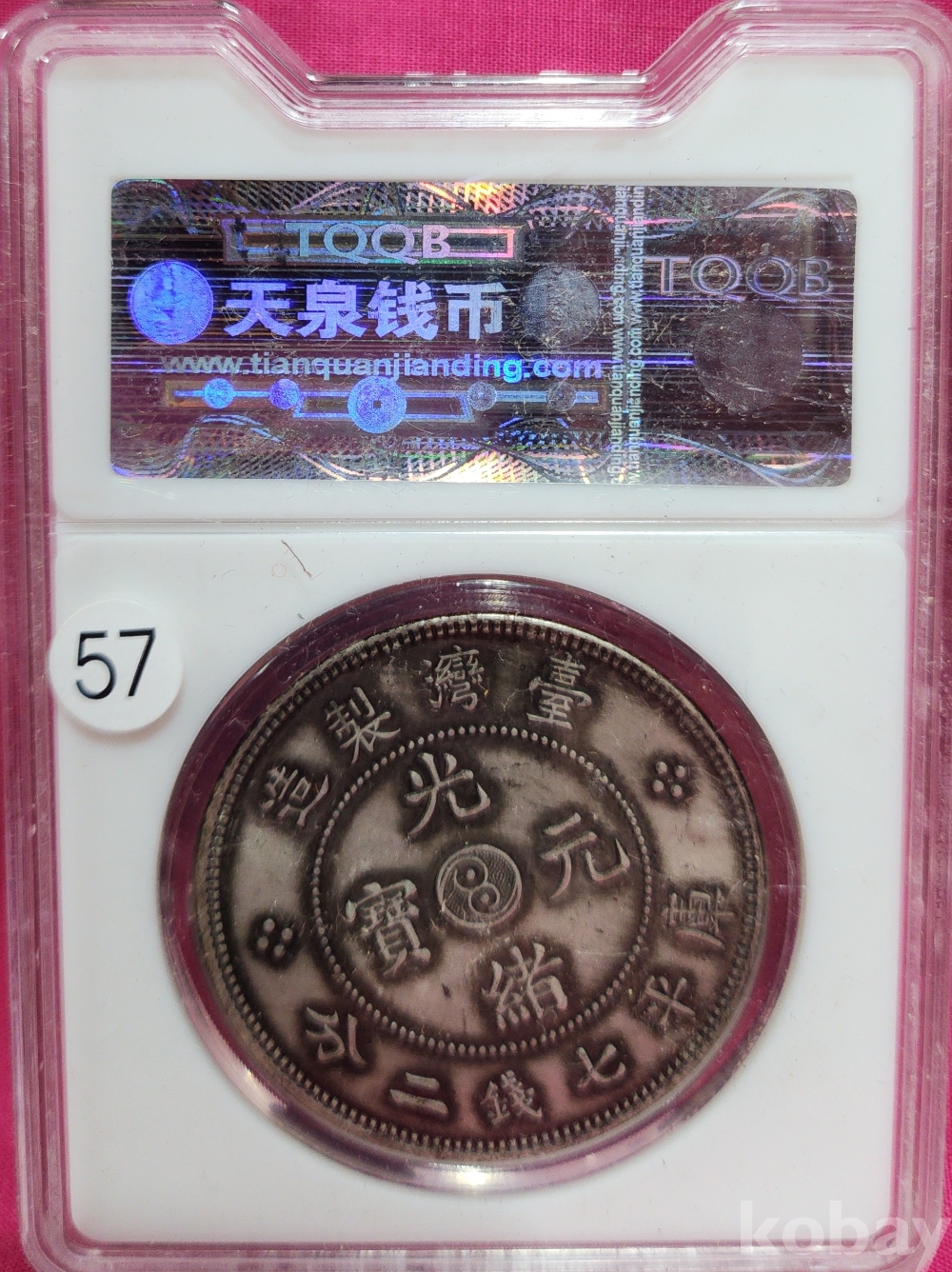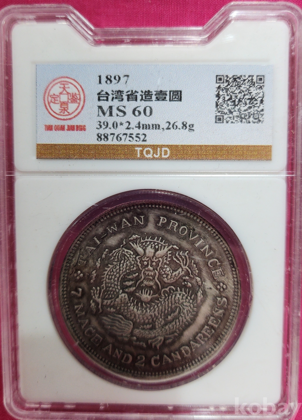 1897년  큐알코드(QR CODE)가 함께하는 은색  광서원보 (光緖元寶)' 화패로 밀봉된 상태입니다,