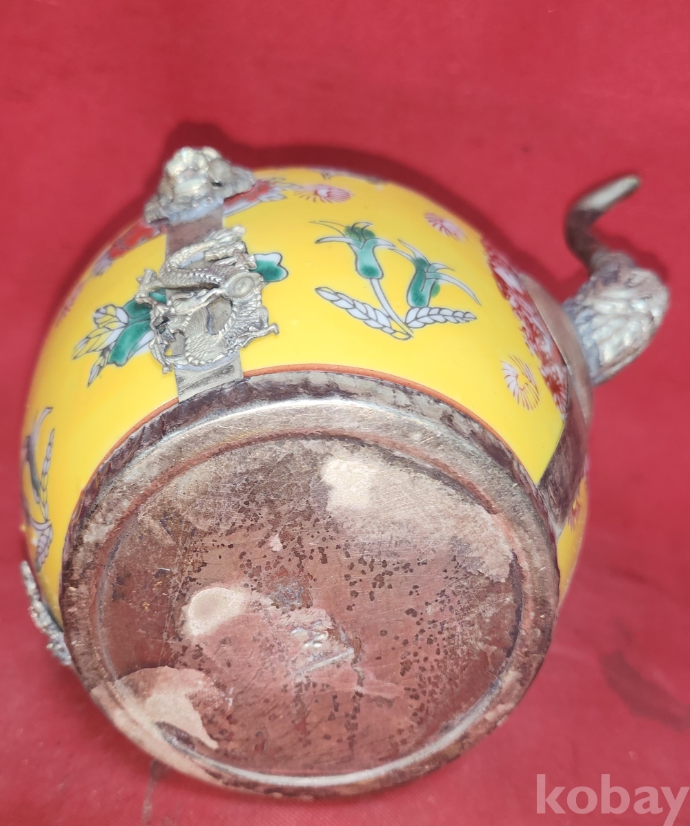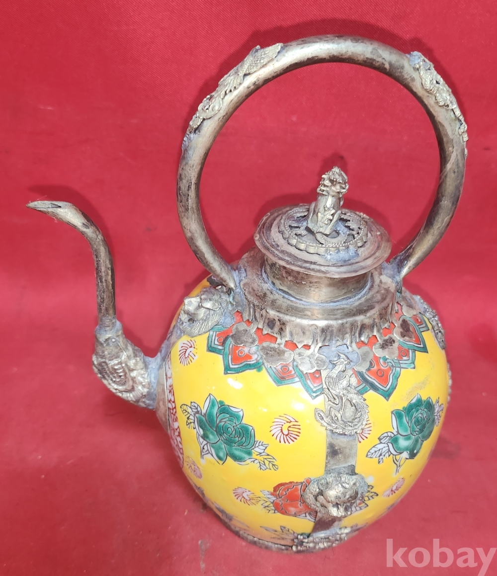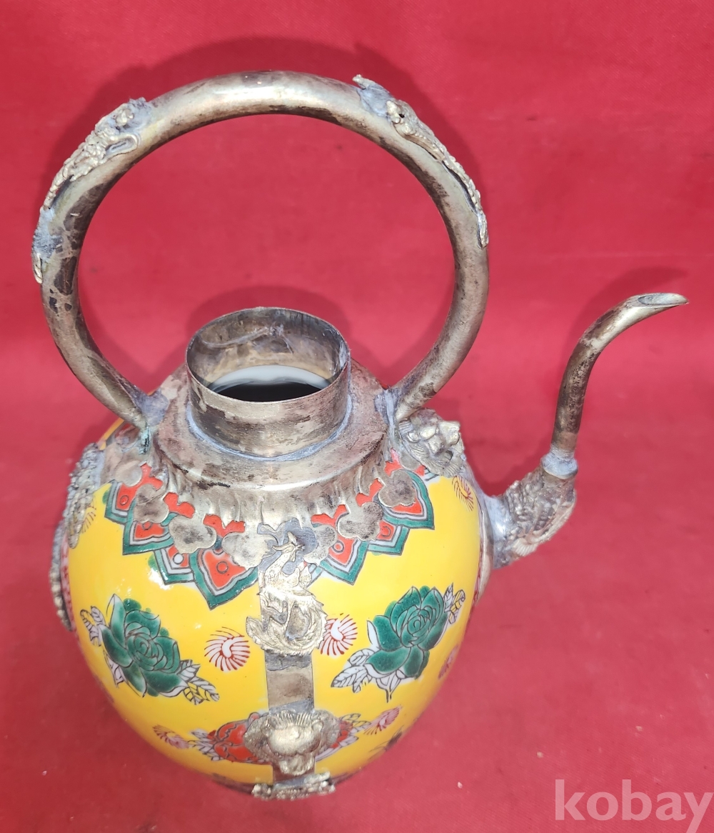 황유 꽃문양 도자기 위에 백동 용.봉황.사자,박쥐.등의 문양이 양각으로 돌출된 주전자입니다,