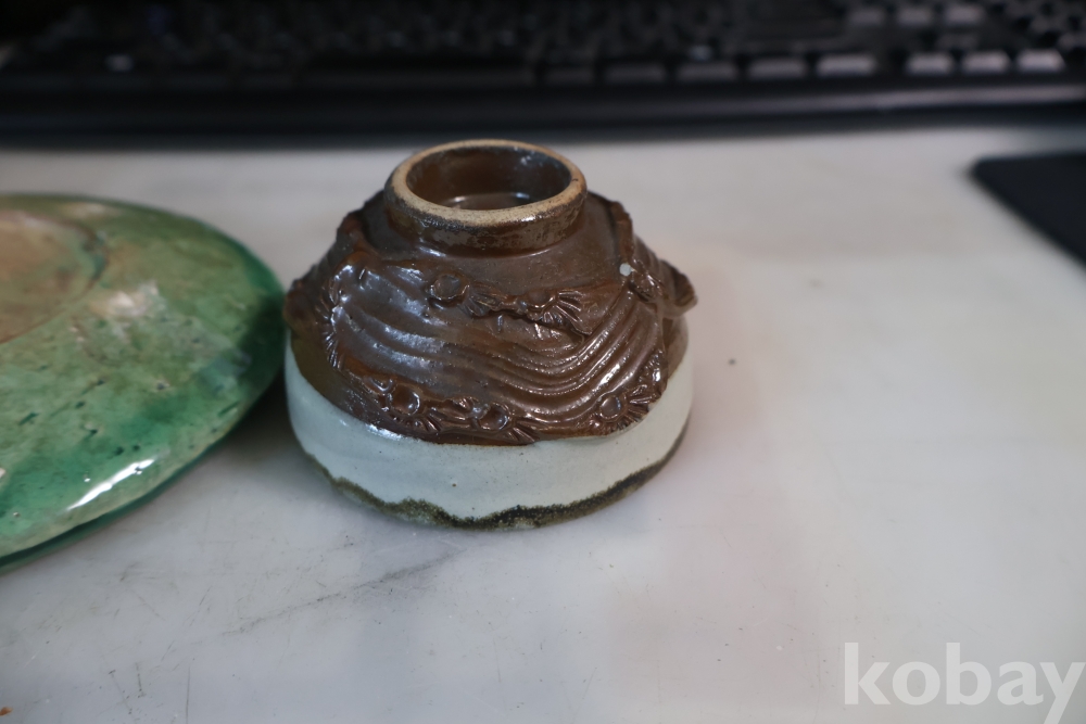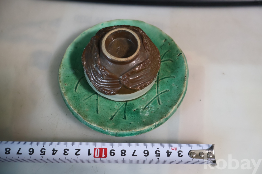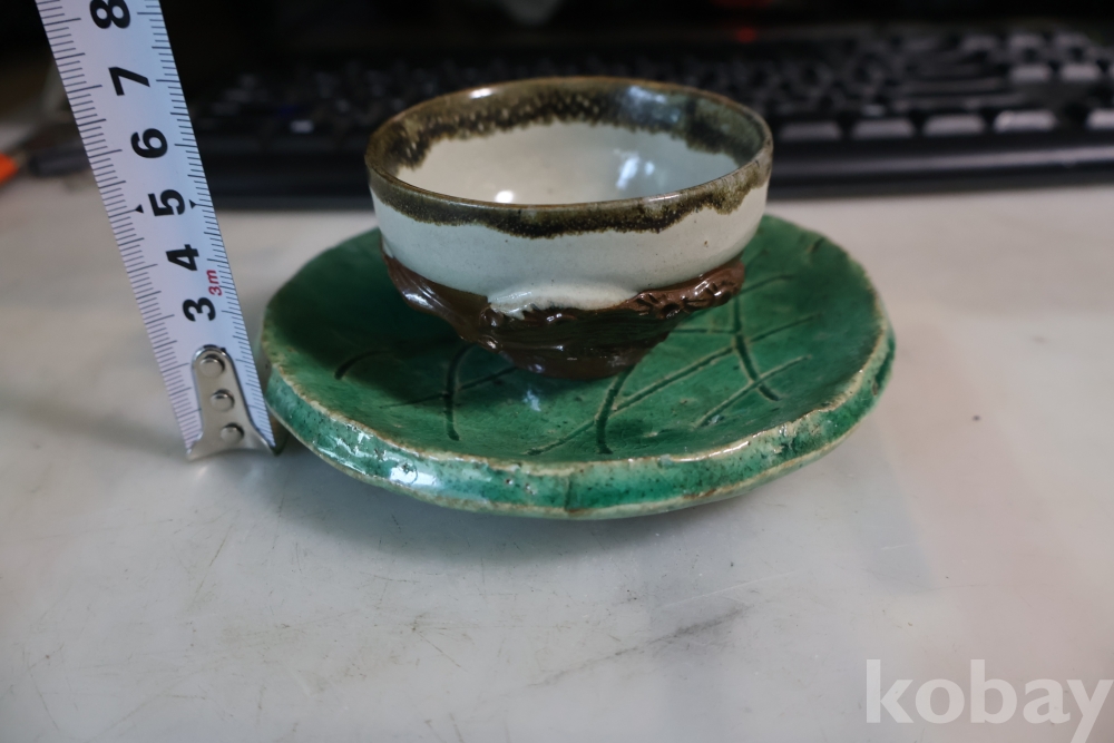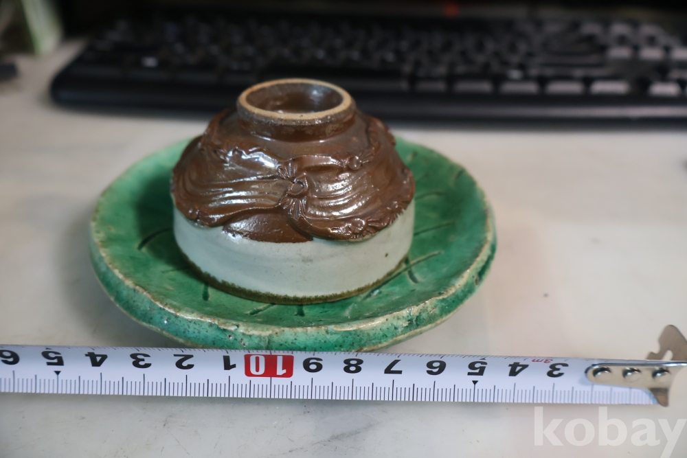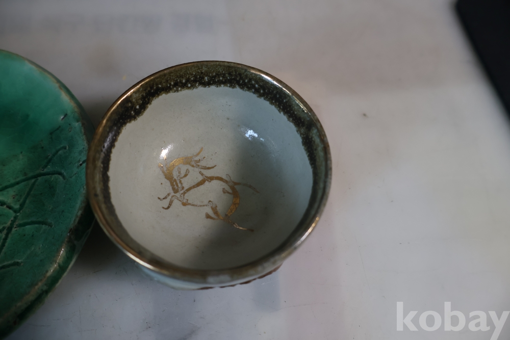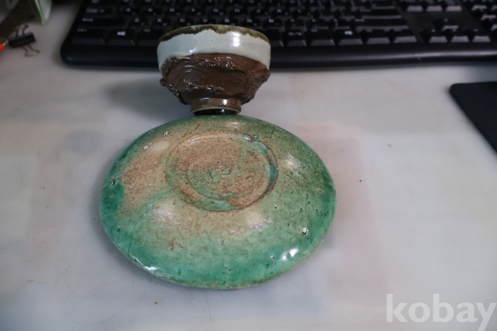 일본 도자기 세트 멋진 소마 말 도자기 와 두터운 질감의 녹색 도자기 받침대 임니다 멋진 조화를 가진 세트 임니다