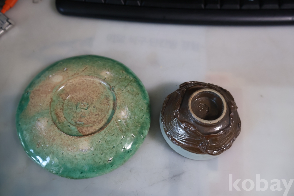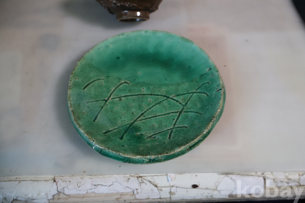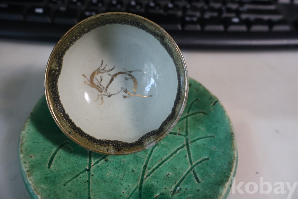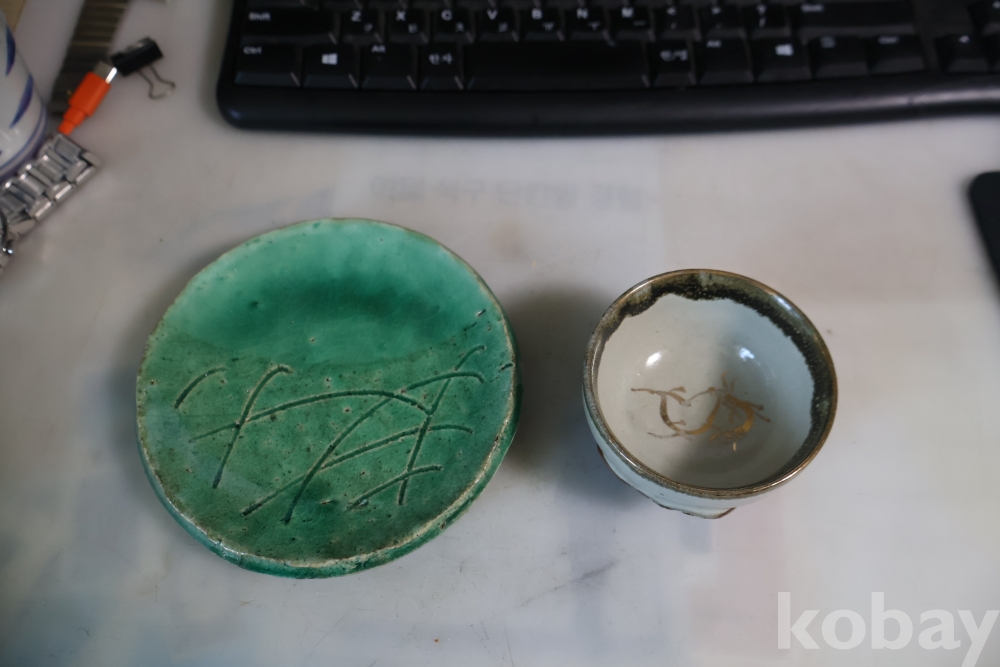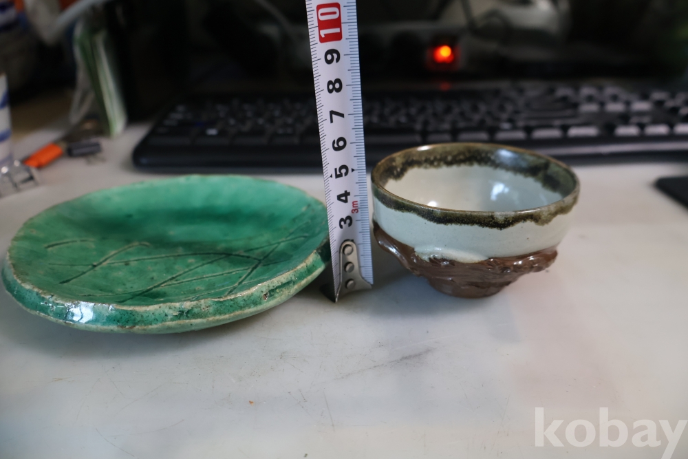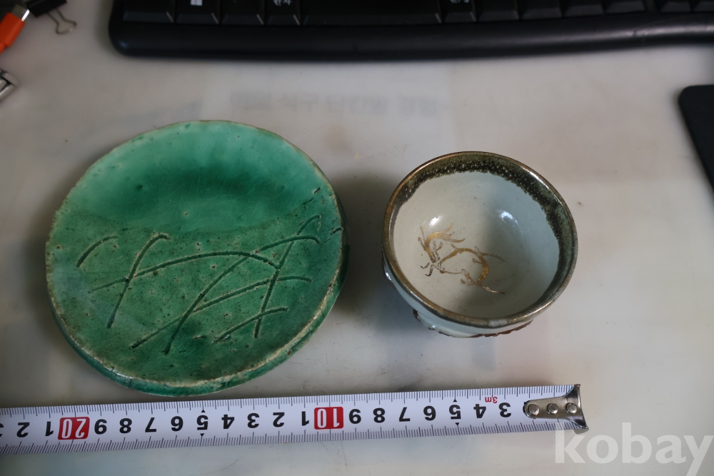일본 도자기 세트 멋진 소마 말 도자기 와 두터운 질감의 녹색 도자기 받침대 임니다 멋진 조화를 가진 세트 임니다