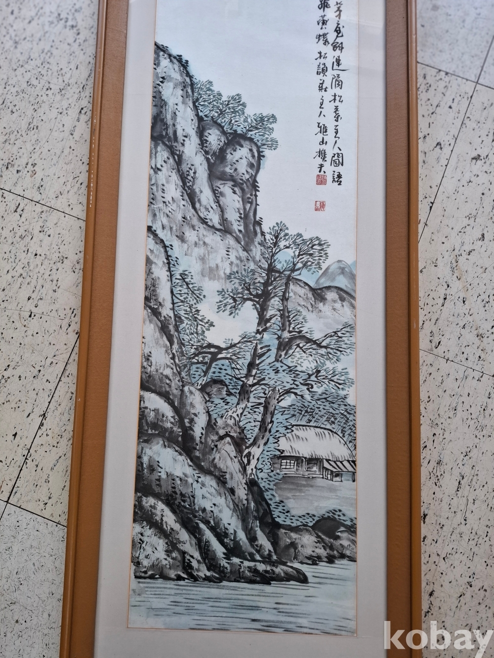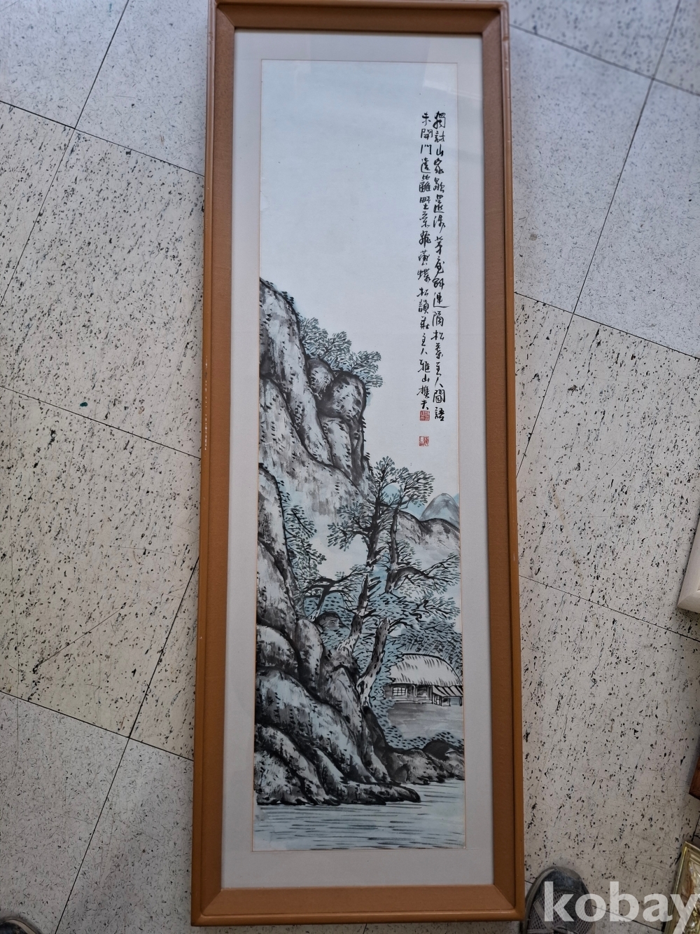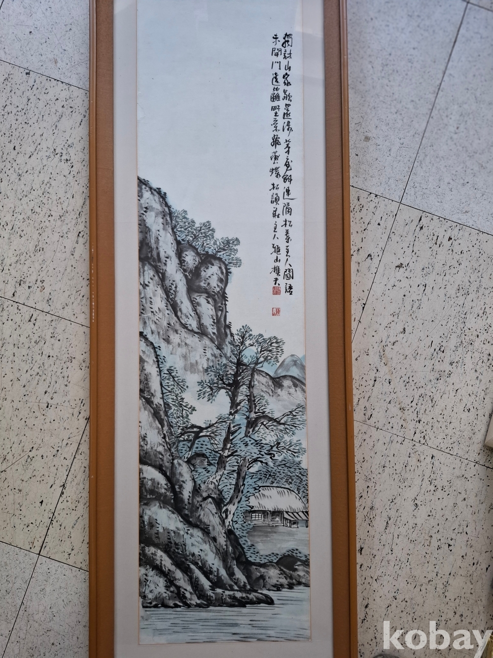 아산 조방원(雅山 趙邦元, 1926~2014) 선생이 젊은 시절 그린 하경산수화입니다. 전통 산수화 구도를 기반으로, 강인한 필선과 절제된 먹빛으로 바위와 나무, 초가를 담아내며 한국적 서정미를 구현한 작품입니다. 초기 화풍의 특징이 잘 드러나 있어 작가의 예술 세계 변천사를 확인할 수 있는 귀중한 자료적 가치를 지닙니다. 작품 크기는 134x34cm이며, 유리 액자 상태로 보존 상태 또한 양호합니다.