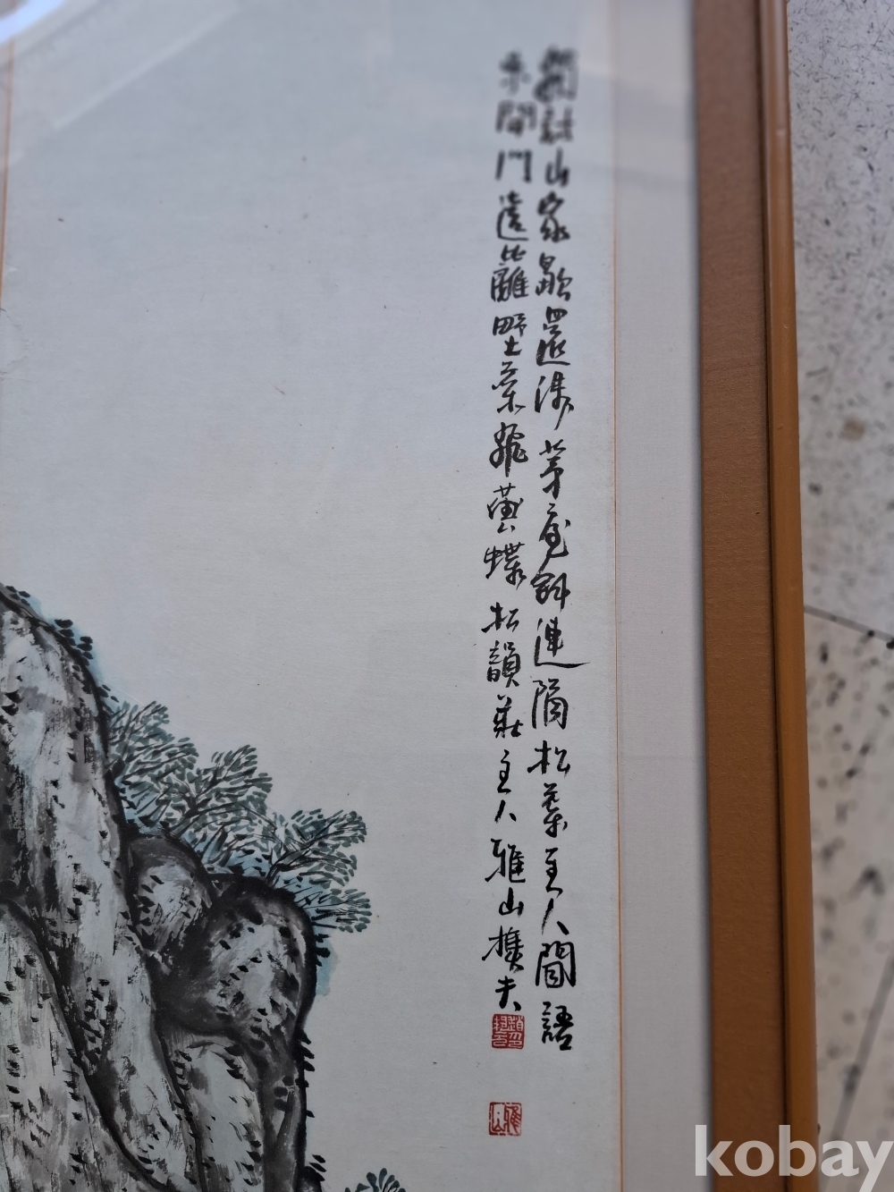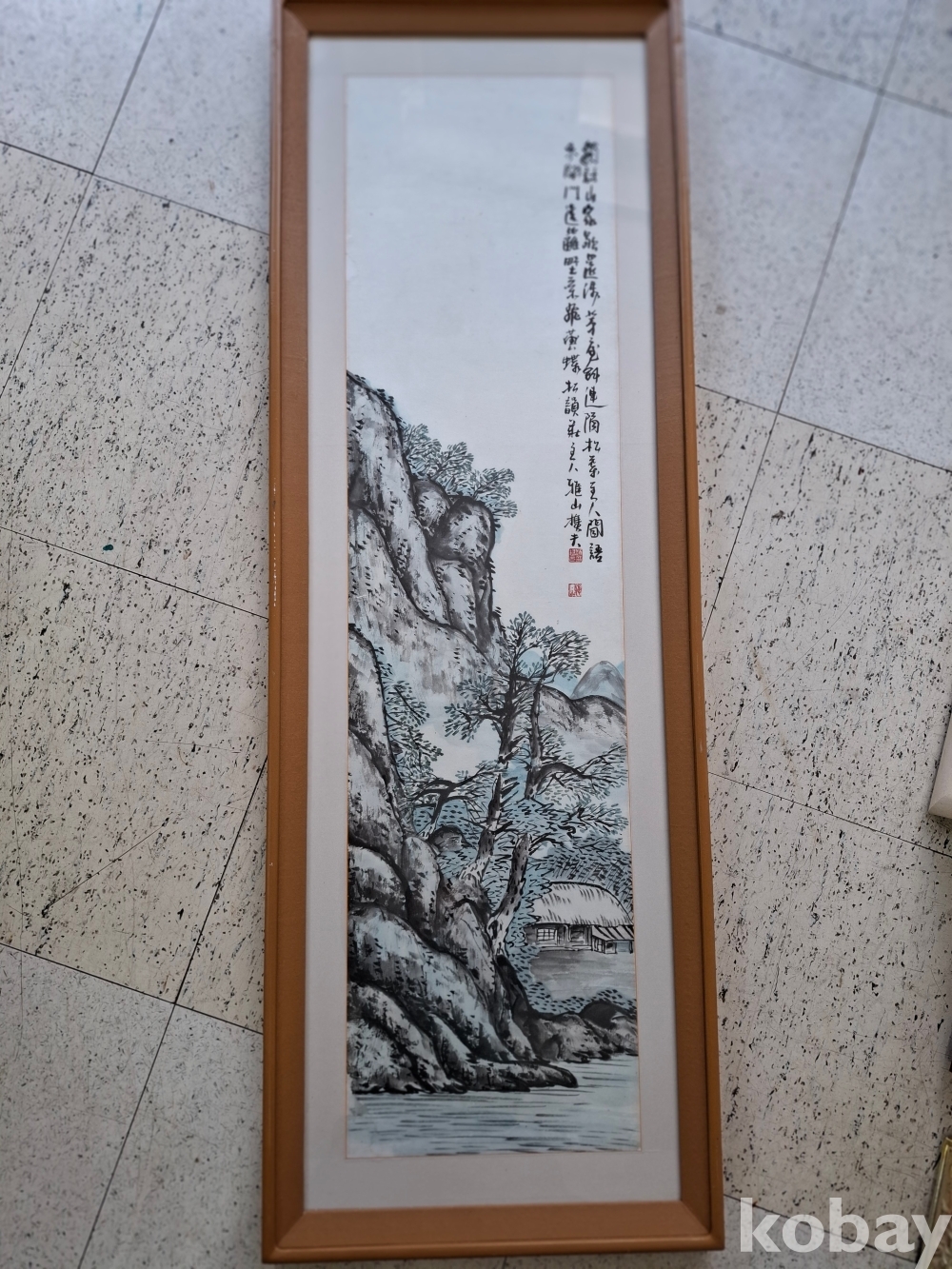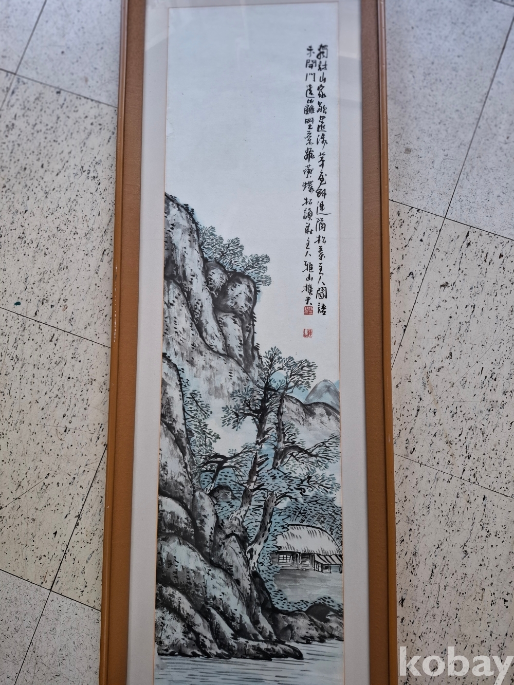 아산 조방원(雅山 趙邦元, 1926~2014) 선생이 젊은 시절 그린 하경산수화입니다. 전통 산수화 구도를 기반으로, 강인한 필선과 절제된 먹빛으로 바위와 나무, 초가를 담아내며 한국적 서정미를 구현한 작품입니다. 초기 화풍의 특징이 잘 드러나 있어 작가의 예술 세계 변천사를 확인할 수 있는 귀중한 자료적 가치를 지닙니다. 작품 크기는 134x34cm이며, 유리 액자 상태로 보존 상태 또한 양호합니다.