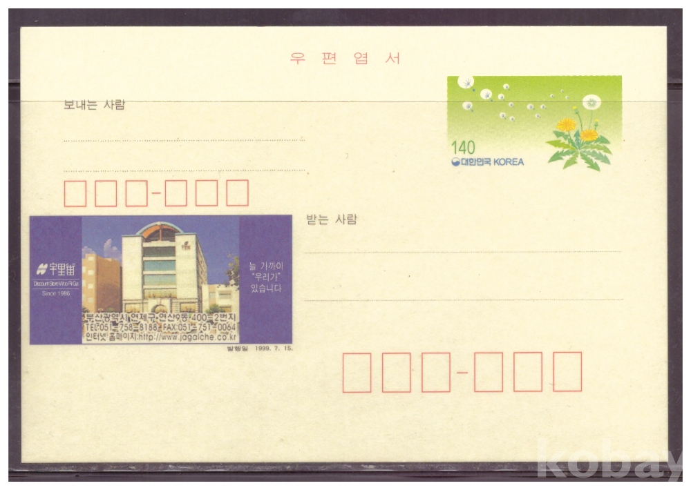 (광고엽서) 1999.7.15 지방판 LAPC326 제일통상 (민들레 140원)