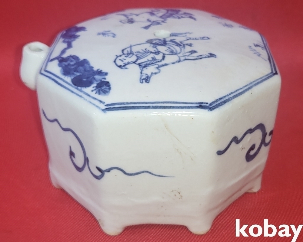 청화 송화(松下) 기마 인물문 팔각형 큰 연적으로 도안이 아주 아름답습니다,