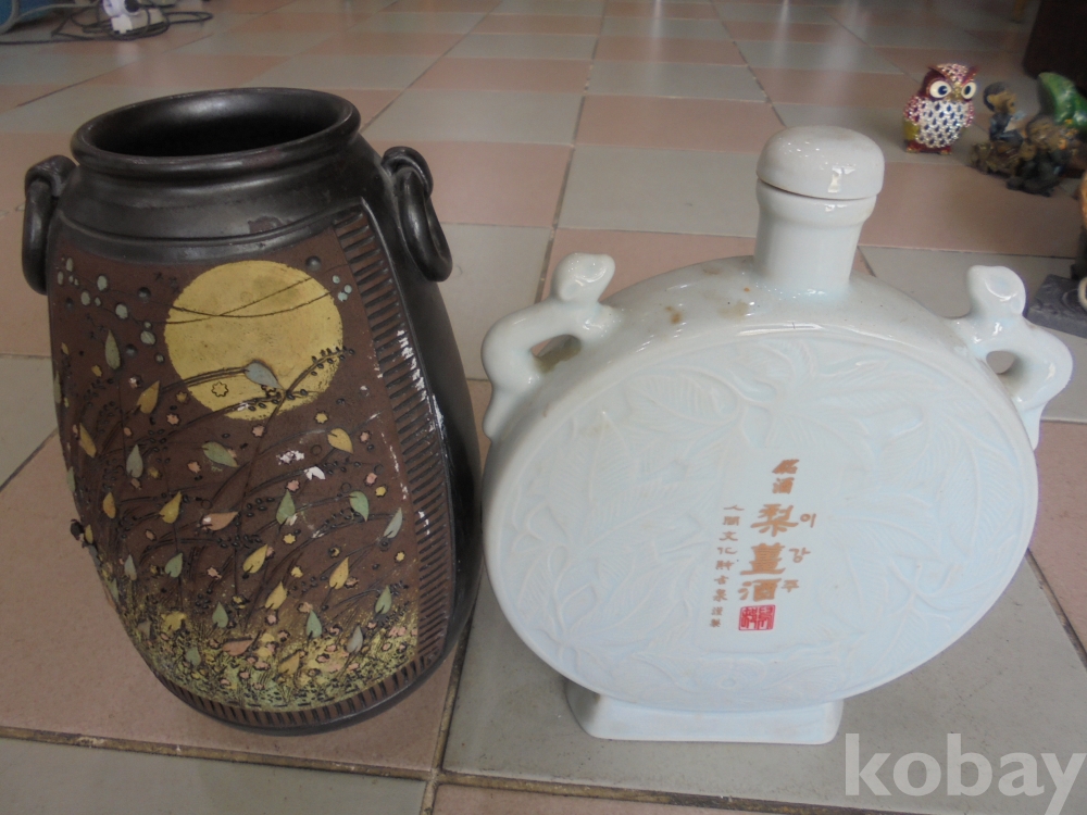 달밤 입체적인 꽃봉우리와 갈대류로 그림들어간 흑도자기 완전예술적인 단지작품과 단원그림들어간 예술적인 이강주 백자 술병 총2점