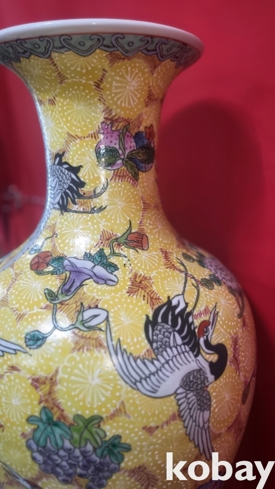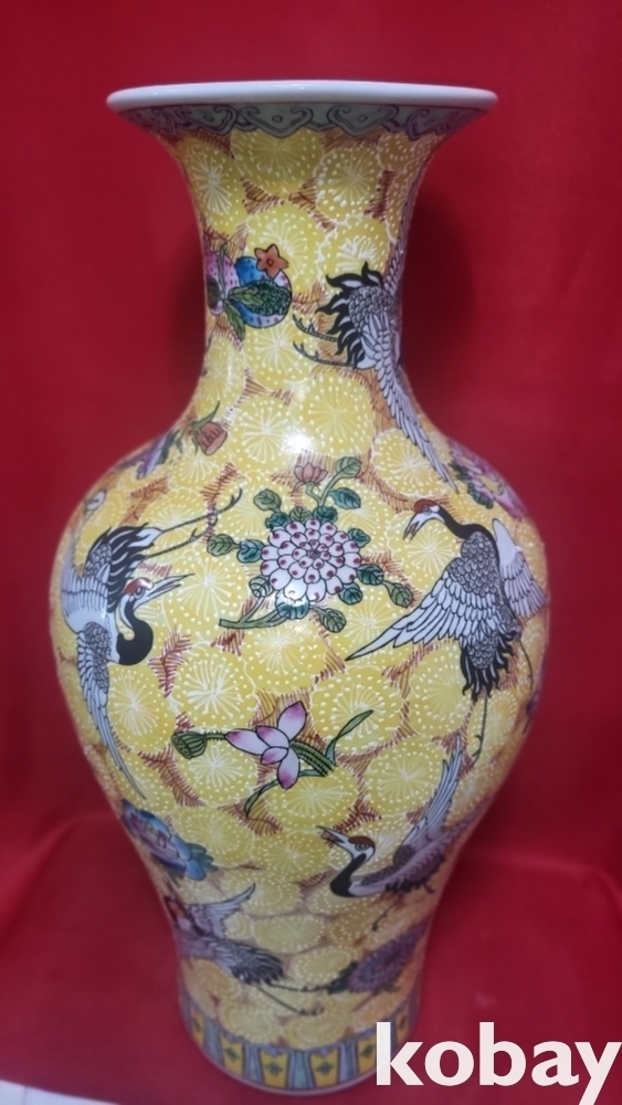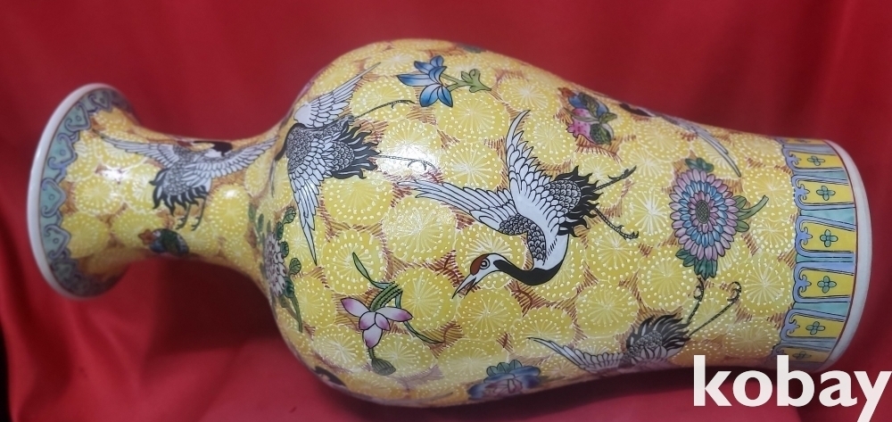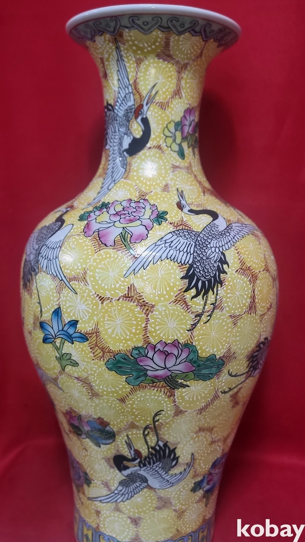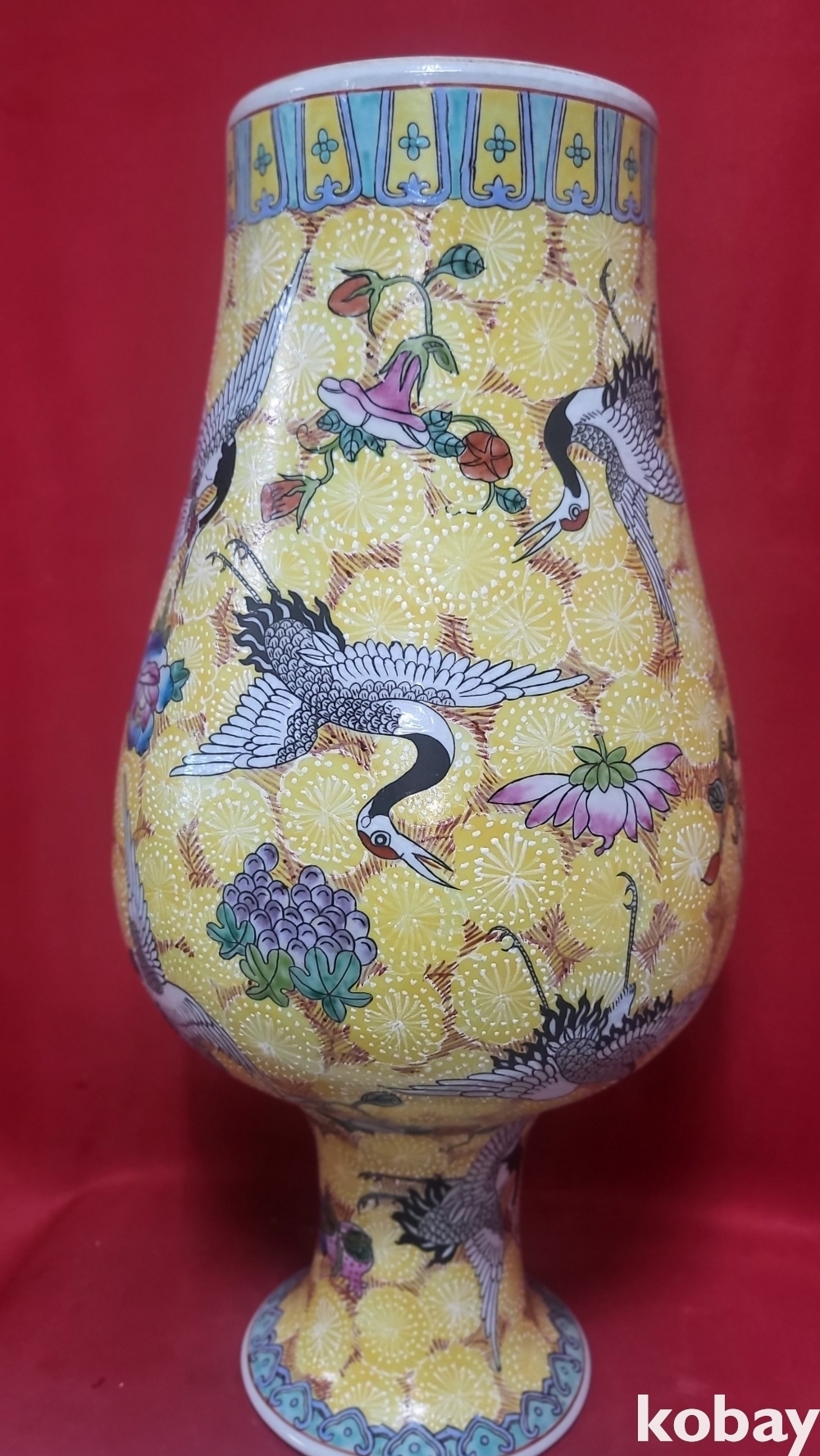 대청건륭 관지 보이는 분채(粉彩) 황지 꽃과 학(花鶴)문양 대형급 항(樽)입니다,