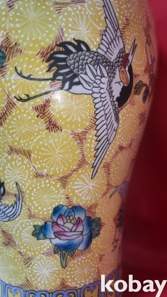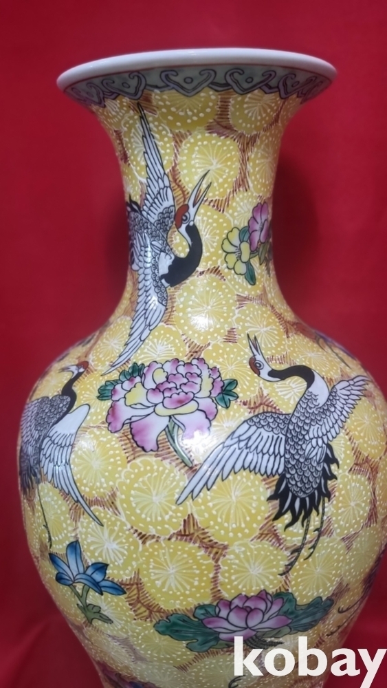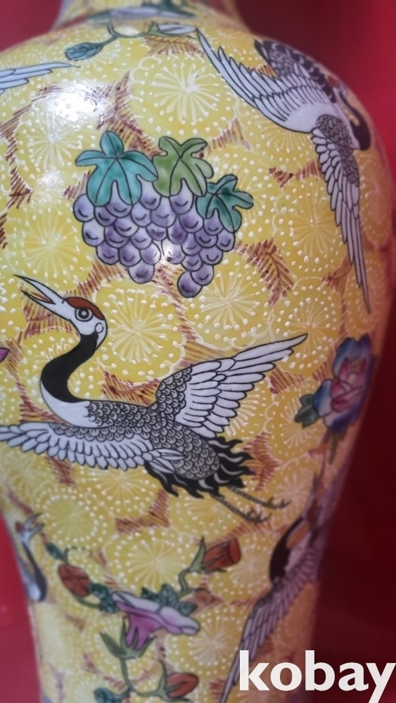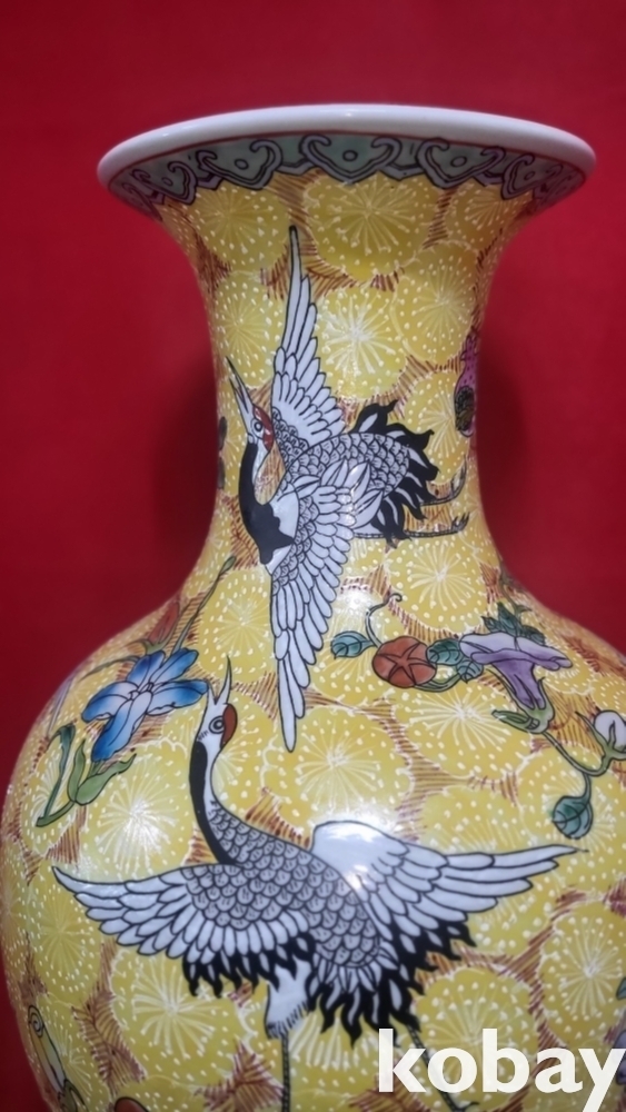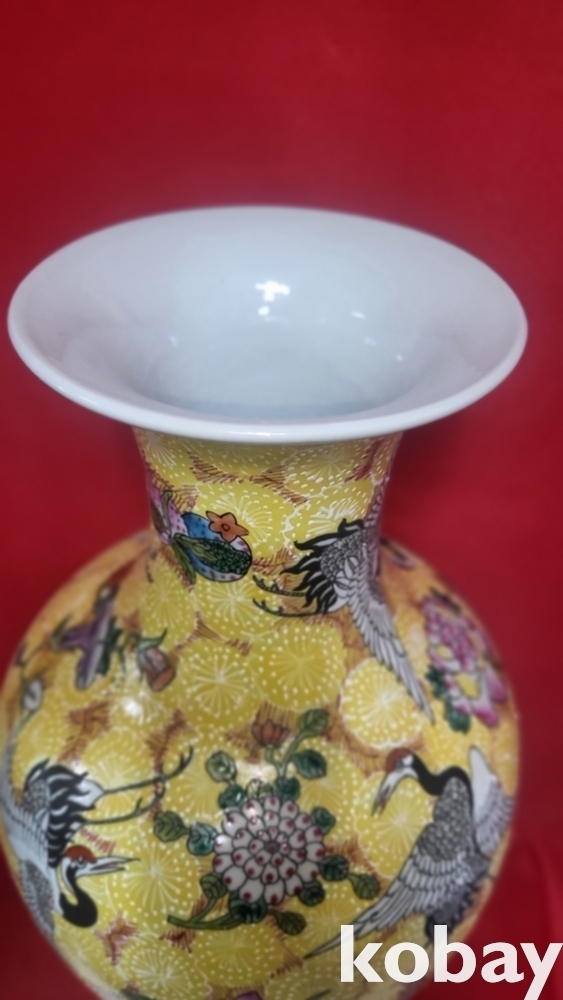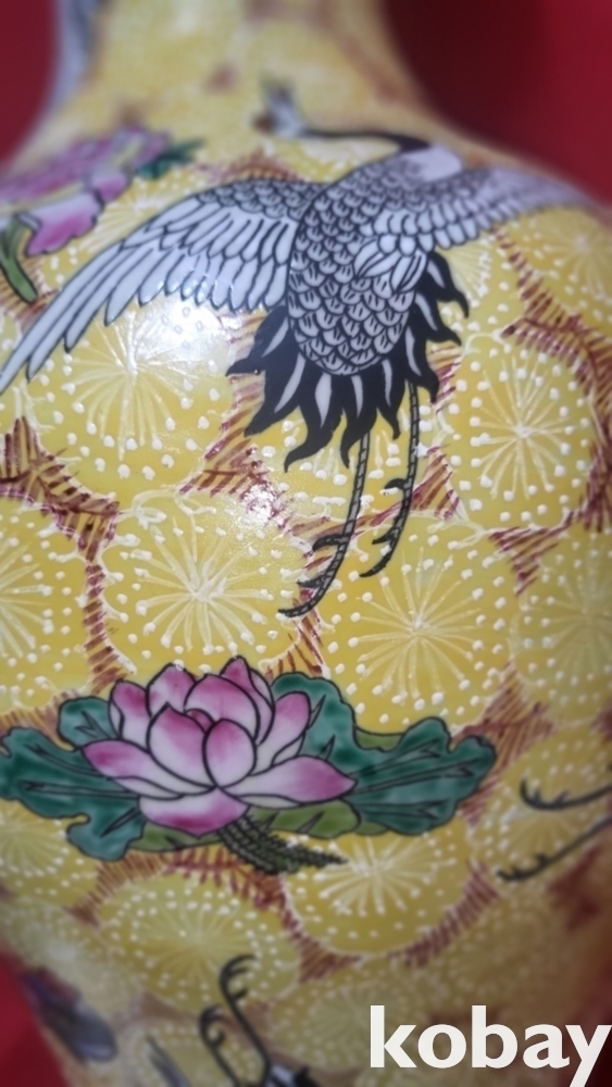 대청건륭 관지 보이는 분채(粉彩) 황지 꽃과 학(花鶴)문양 대형급 항(樽)입니다,
