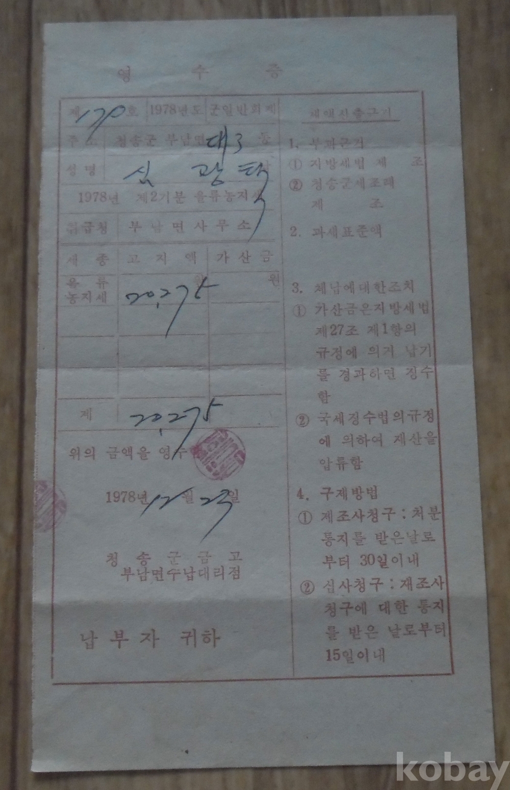 1978년 청송군부남면 을류농지세 영수증
