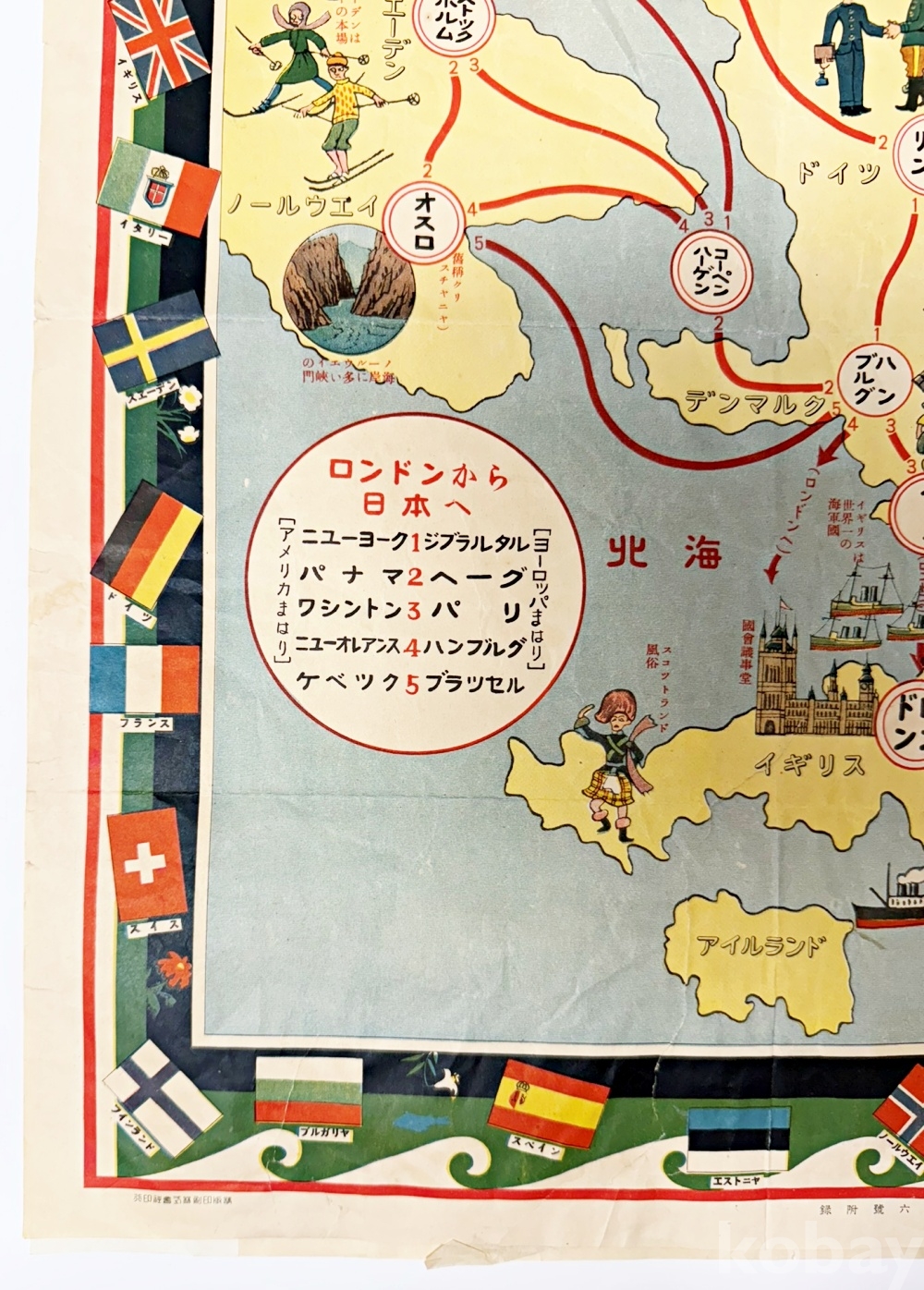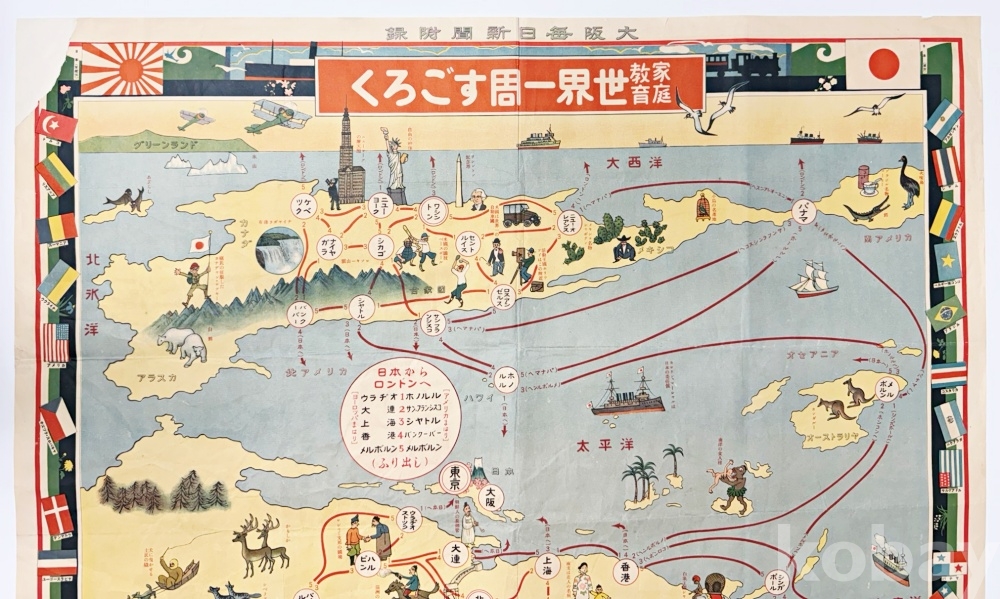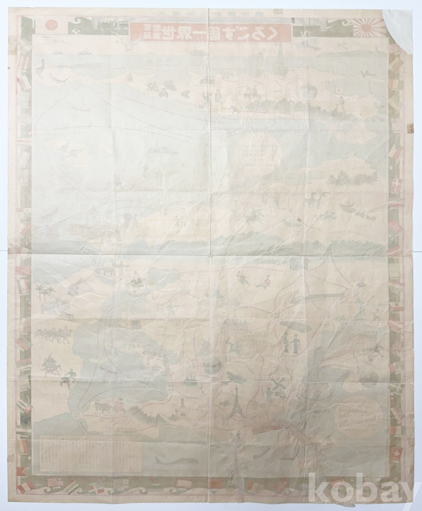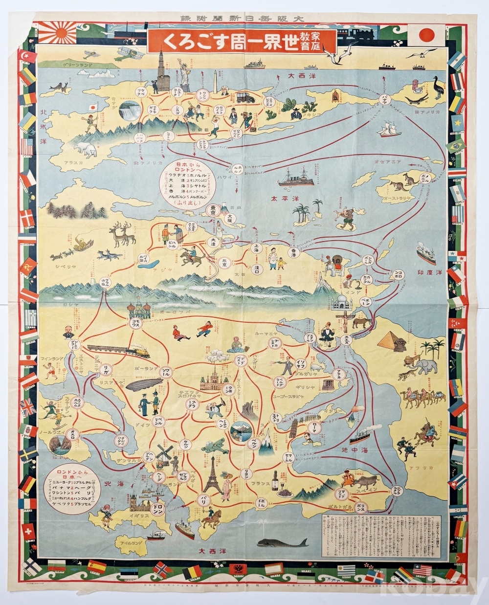 상품 설명 | 1926년 대판매일신문 15306호의 부록으로 첨부되었던, 세계일주 쌍육 놀이판 1점이다. 지도는 보통의 쌍육 놀이판과는 다르게 일본이 북쪽에 있으며, 하단에 유럽과 지중해, 영국 등이 위치한 형태로 제작되었다. 각국의 특징을 표현한 삽화도 수록되어 있다. | ||