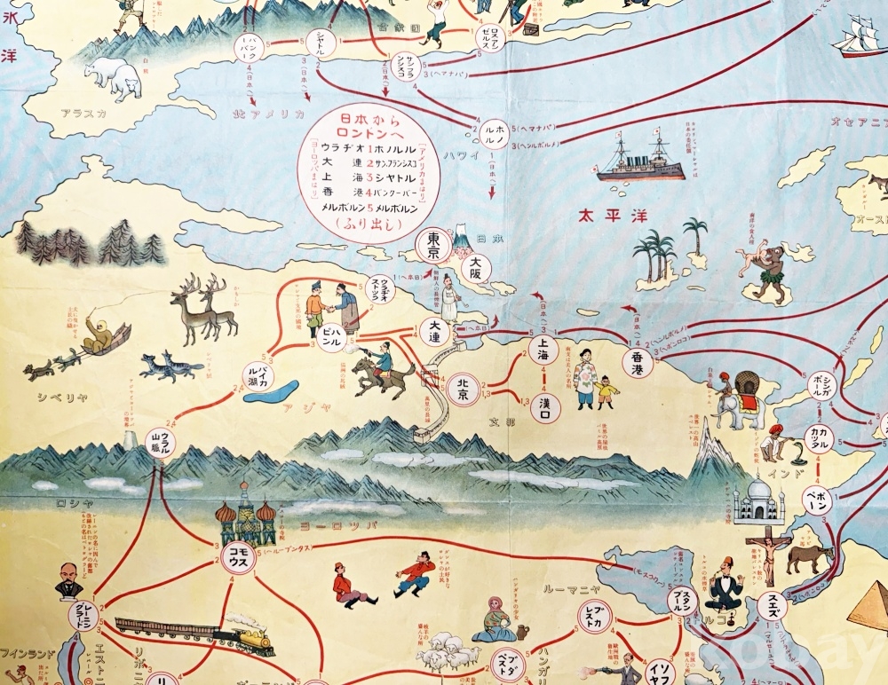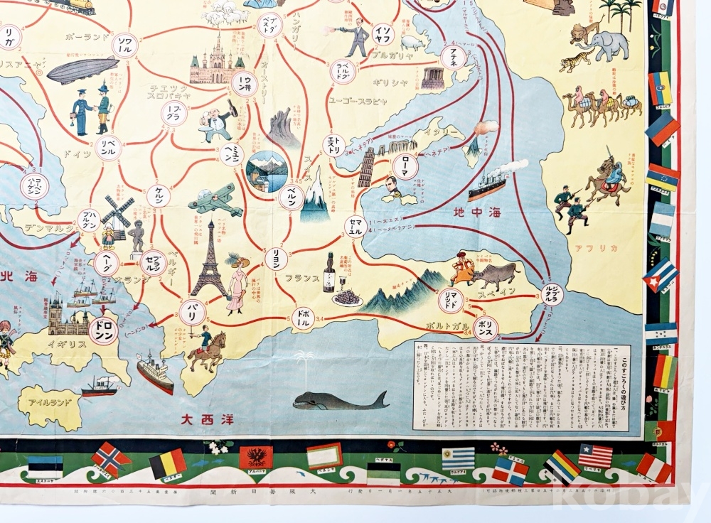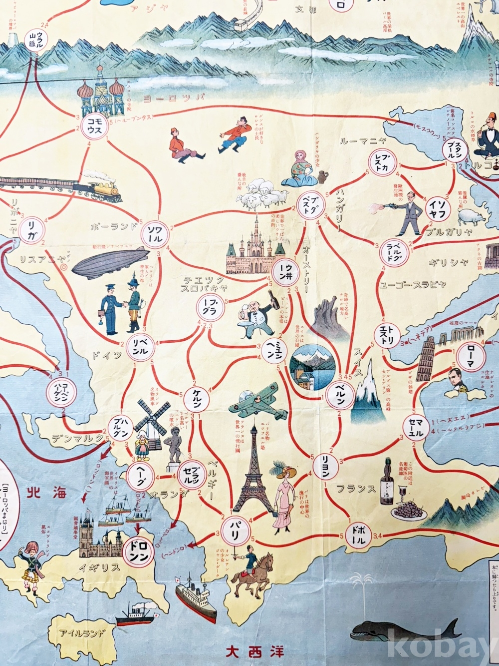 상품 설명 | 1926년 대판매일신문 15306호의 부록으로 첨부되었던, 세계일주 쌍육 놀이판 1점이다. 지도는 보통의 쌍육 놀이판과는 다르게 일본이 북쪽에 있으며, 하단에 유럽과 지중해, 영국 등이 위치한 형태로 제작되었다. 각국의 특징을 표현한 삽화도 수록되어 있다. | ||