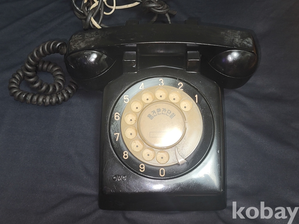 빈티지 세월 감이 느껴지는 동양정밀 1975년 제작 추정 "용건만 간단히"가 적힌 체신부 OPC 검정 다이얼 전화기입니다.
