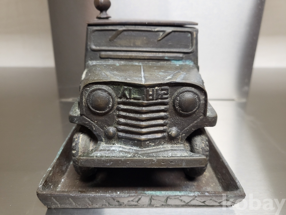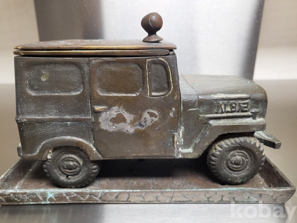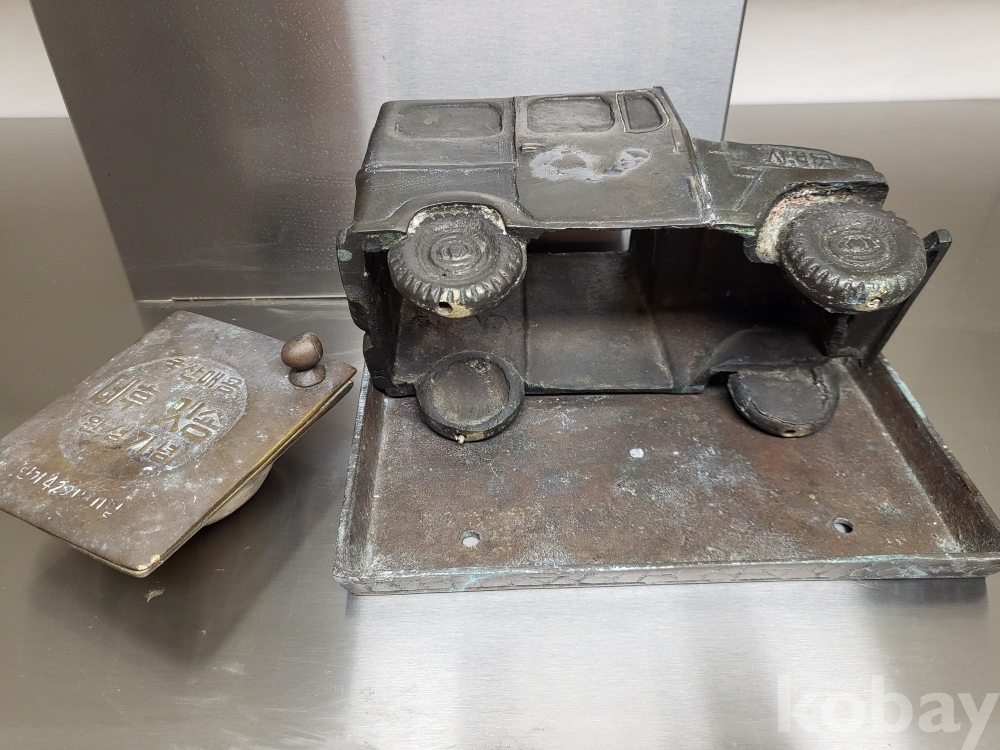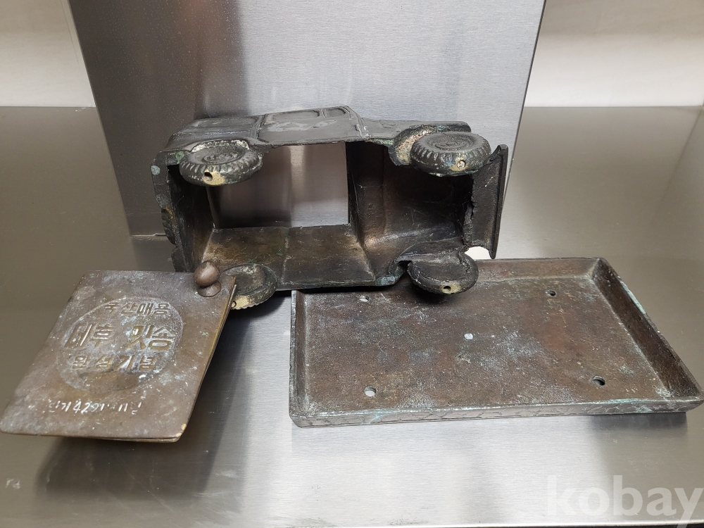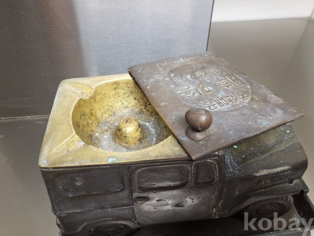 1955년 우리나라 최초자동차 생산기념 재털이입니다 제질은 놋쇠고 3키로정도무게 묵직합니다 앞.옆면 시ㅡ발이라는 문구가있고 자동차 지붕에 국산애용 데후 밋숑 완성기념