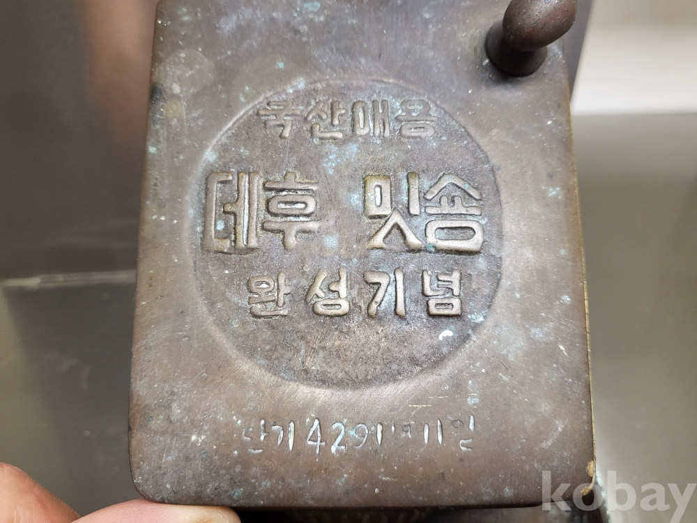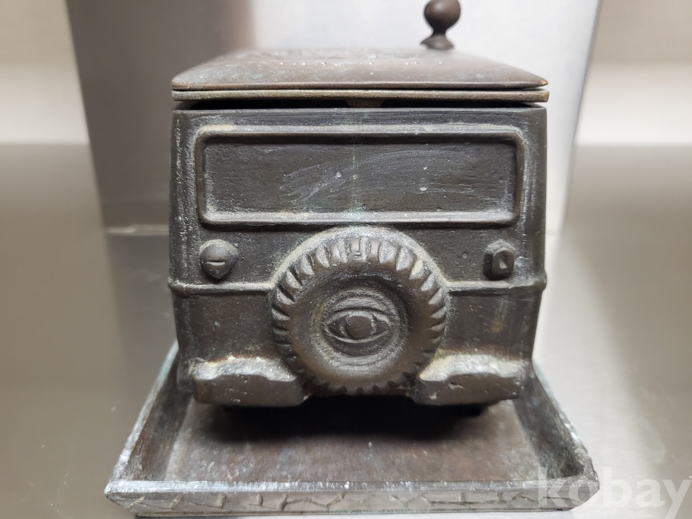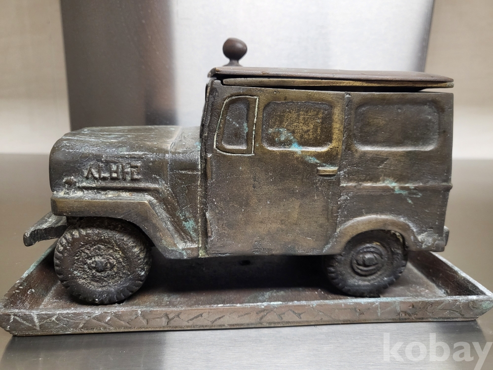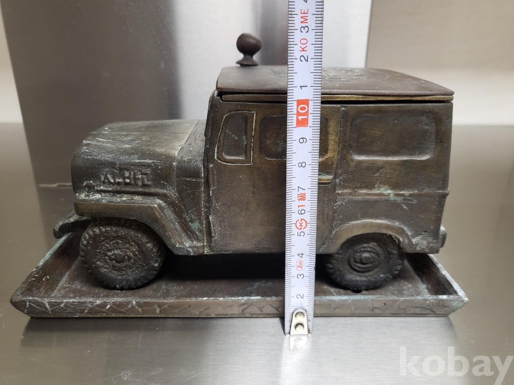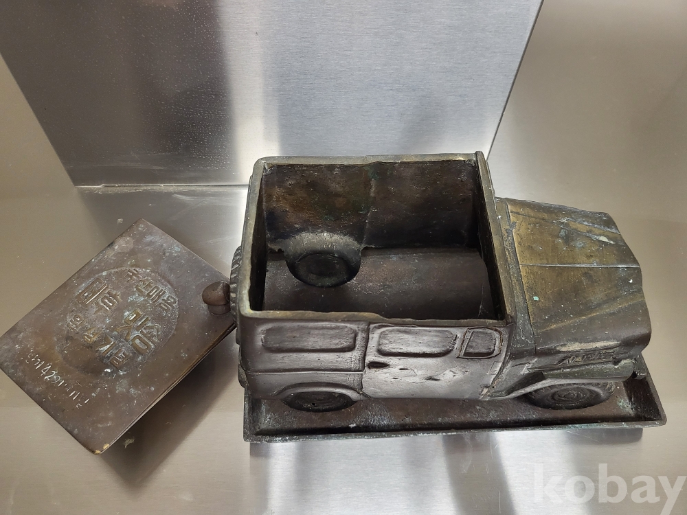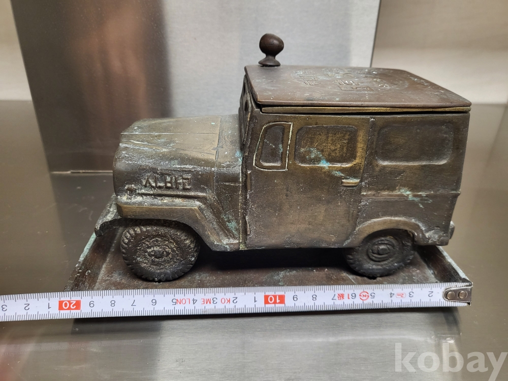 1955년 우리나라 최초자동차 생산기념 재털이입니다 제질은 놋쇠고 3키로정도무게 묵직합니다 앞.옆면 시ㅡ발이라는 문구가있고 자동차 지붕에 국산애용 데후 밋숑 완성기념